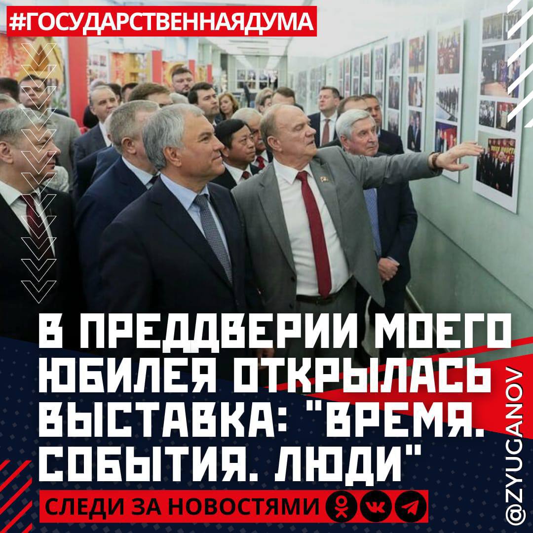 🎉 Друзья! Сегодня в Госдуме открылась выставка по случаю моего предстоящего юбилея. Благодарю всех, кто принял участие в ее организации и проведении. Очень рад, что на церемонию открытия пришли все мои внуки. Это для меня очень важно. Благодарю за присутствие на выставке и добрые слова в адрес юбиляра Чрезвычайного и Полномочного посла КНР в РФ Чжан Ханьхуэя и Чрезвычайного и Полномочного посла Кубы в РФ Хулио Антонио Гармендия Пенья. Название экспозиции - «Геннадий Зюганов. Время. События. Люди» - выбрано неслучайно. Оно отражает мой жизненный, трудовой и политический путь, который неразрывно связан с интересными людьми и ключевыми событиями в истории нашей России. Выставка имеет 7 тематических разделов. Каждый ее раздел - это мой этап в жизни: начиная с детства, службы в рядах Советской армии, продолжая работой в комсомольской и партийной организациях в Орле, заканчивая политической, государственной и международной деятельностью на благо нашей страны. Я из семьи потомственных учителей. Наша педагогическая семья, в которой - 10 педагогов, 350 лет преподавала практически все школьные предметы. Они учили подрастающее поколение всему самому доброму и вечному, всегда преданно служили нашей великой державе. Именно они заложили главные ценности в моей жизни - это справедливость, дружба, товарищество и любовь к Родине. Я считаю, что эти ценности как никогда важны в современном мире.