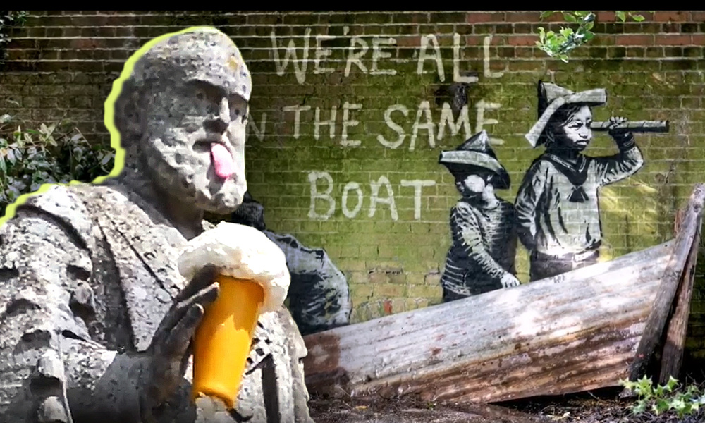 В Грейт-Ярмуте он изобразил людей, танцующих на автобусной остановке, в Горлстоне — подъемный кран, в парке города Олтон-Брод — троих детей в лодке с подписью «Все мы в одной лодке». На пляже в Кромере появилась группа раков-отшельников с табличкой «Только элитная аренда». В одном городе Бэнкси сунул в руки памятнику пластиковое мороженое. Оказалось, это именно то, чего не хватало скульптуре.