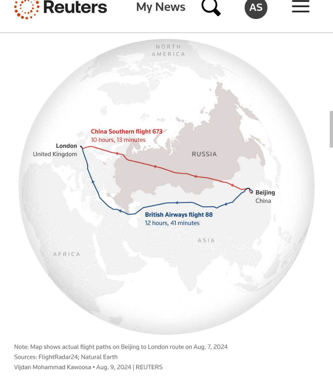 "По данным Flightradar24, рейс British Airways Пекин-Лондон выполняется примерно на 2-2,5 часа дольше, чем тот же рейс China Southern.