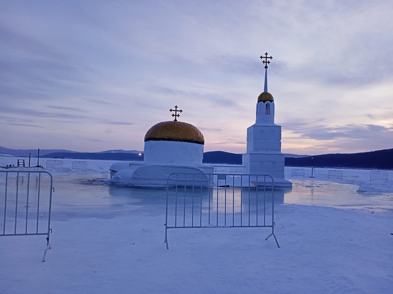 Сегодня днём в Миассе ожидали приезда митрополита Челябинского и Миасского Алексия для малого освящения воды в купели, оборудованной внутри часовни. Однако ночью снежное сооружение ушло под лёд.