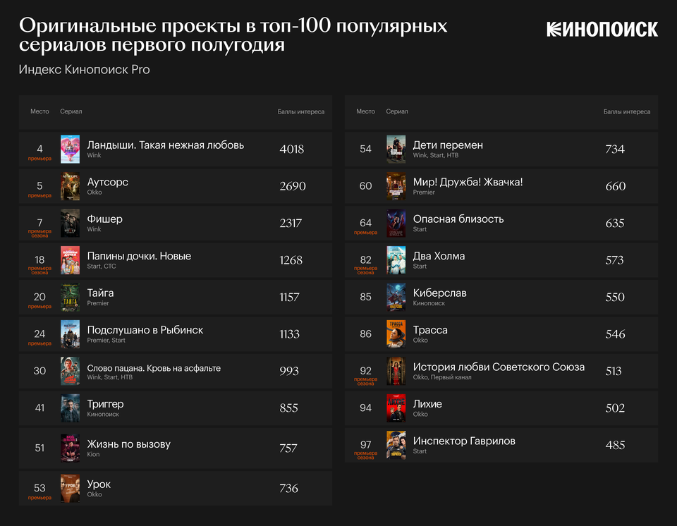 Такое снижение интереса к российским проектам можно объяснить прежде всего меньшей заметностью премьер. Так, среди 11 отечественных проектов, что попали в топ-20 самых популярных сериалов за первую половину 2025 года, только три новинки. Все они — собственные проекты онлайн-кинотеатров. Это уже упомянутый самый популярный российский сериал полугодия «Ландыши. Такая нежная любовь», а также «Аутсорс» (Okko) и «Тайга» (Premier).