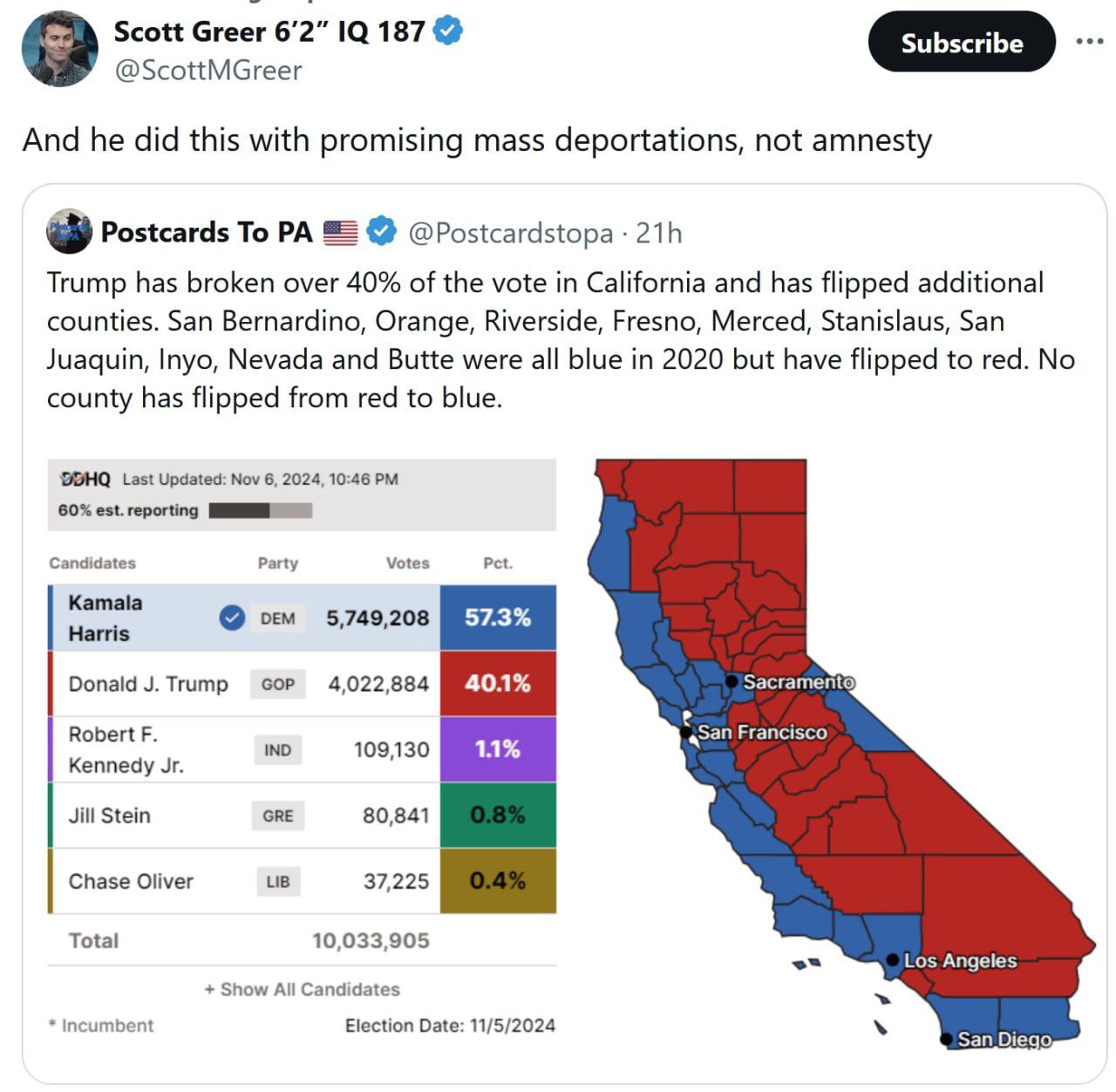 ✔️ Дональд Трамп показал лучший результат — более 40 % — среди республиканцев, баллотирующихся на пост президента в штате Калифорния, со времен Джорджа Буша-младшего в 2004 году, при этом он вел явную кампанию по массовой депортации YTKTUFKMYS[ VBUHFYNJD.