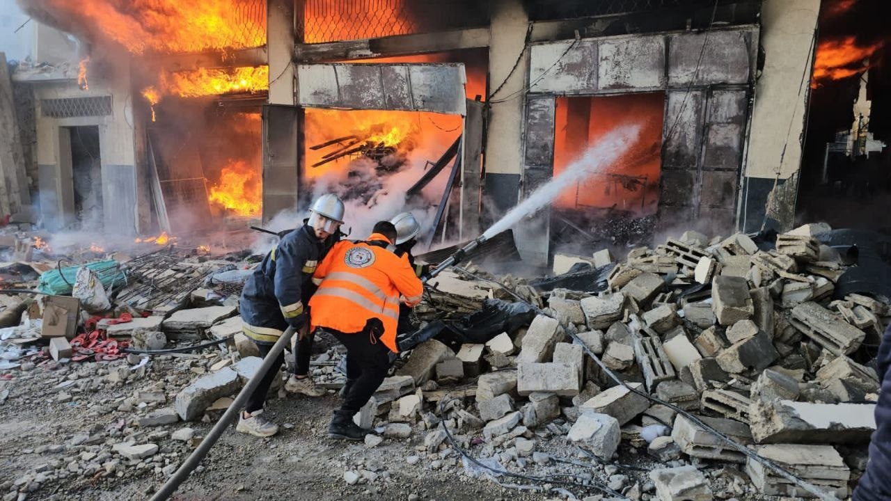 Бригада гражданской обороны тушит пожара, возникший в результате израильской бомбардировки дома семьи Аль-Шаер в Хан-Юнисе на юге сектора Газа.