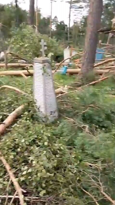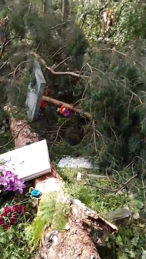 Сильнее всего под удар попало местное кладбище: памятники были разбиты и свалены. Сосны вырваны из земли с корнем. Могилы исчезли под завалами веток и деревьев. Последствия бури можно увидеть на фото, которыми поделились местные жители, посетившие кладбище после непогоды.