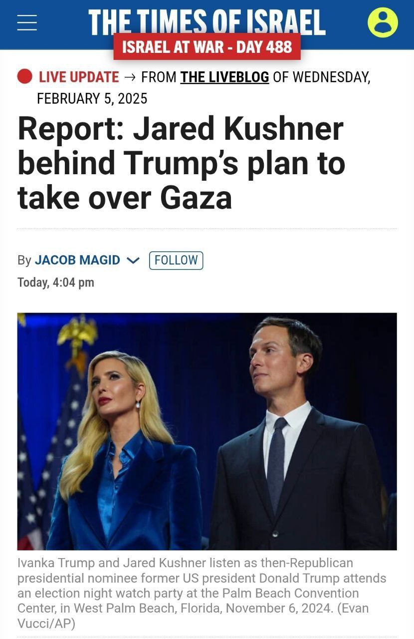 Зять президента США Джаред Кушнер стоит за «Планом для Газы» Трампа, включающем полную депортацию палестинцев из региона, — утверждает Times Of Israel