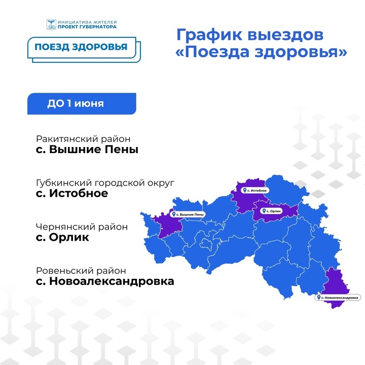 Губернатор Белгородской области Вячеслав Гладков опубликовал информационные карточки с графиком работы «Поездов здоровья» на первые летние месяцы и начало августа.