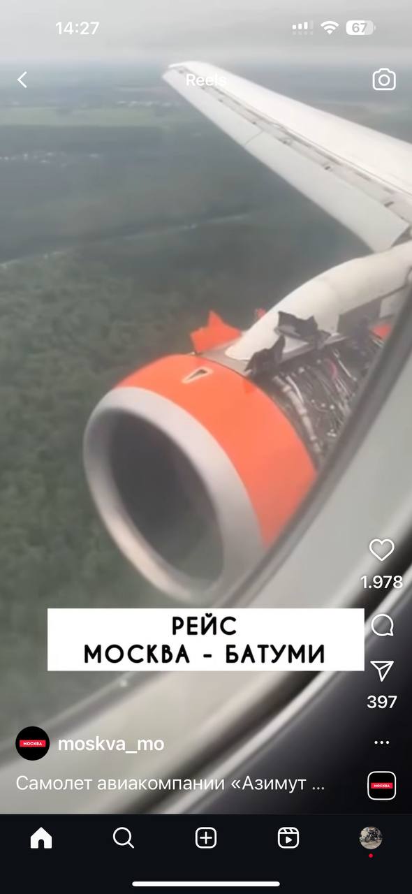 Час от часу не легче. Надо расследовать с прицелом на терракт. Рейс авиакомпании «Азимут» Москва - Батуми. Взлетели, обшивка движка отлетела, вернулись и сели во Внуково. 91 пассажир.