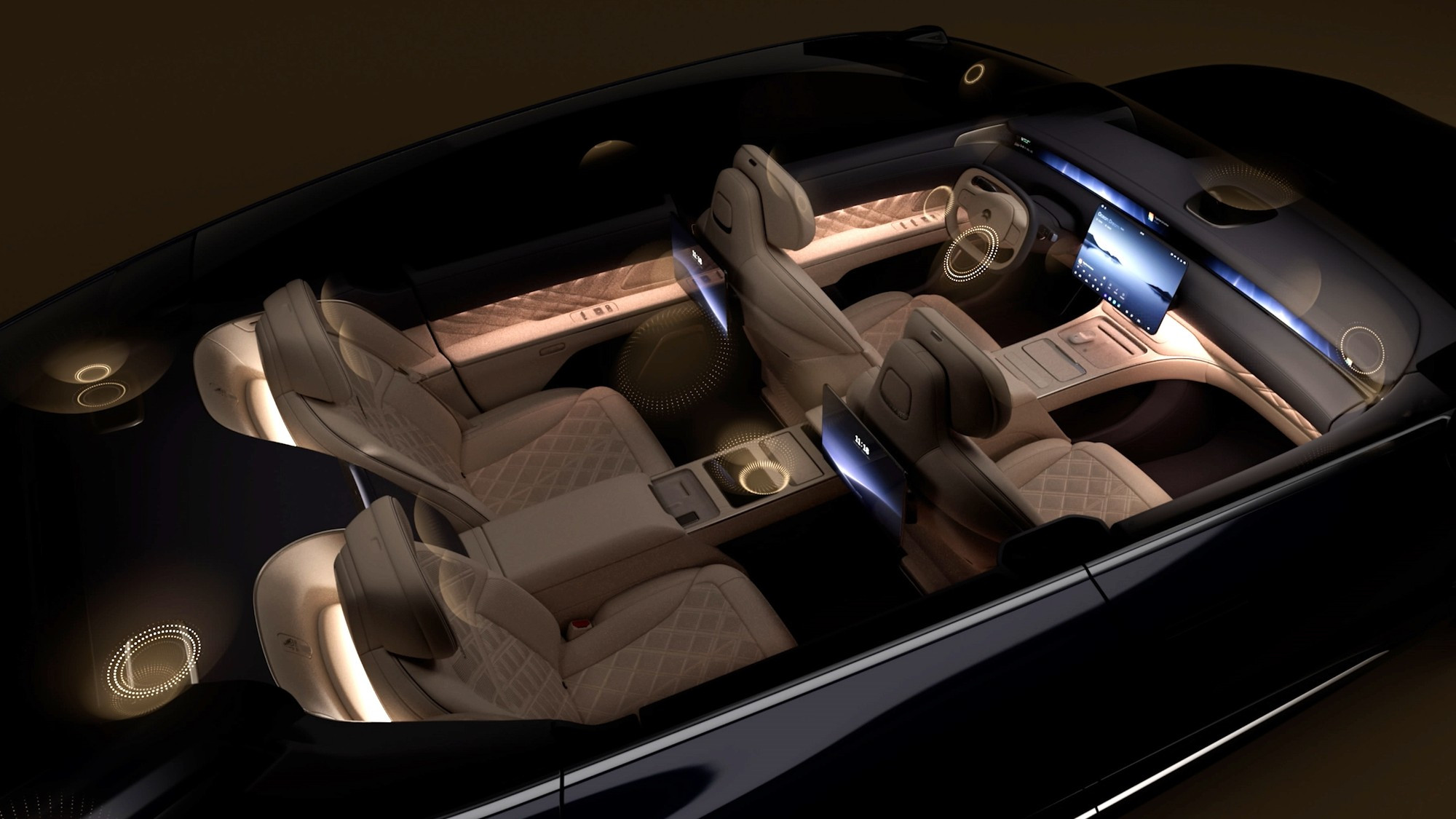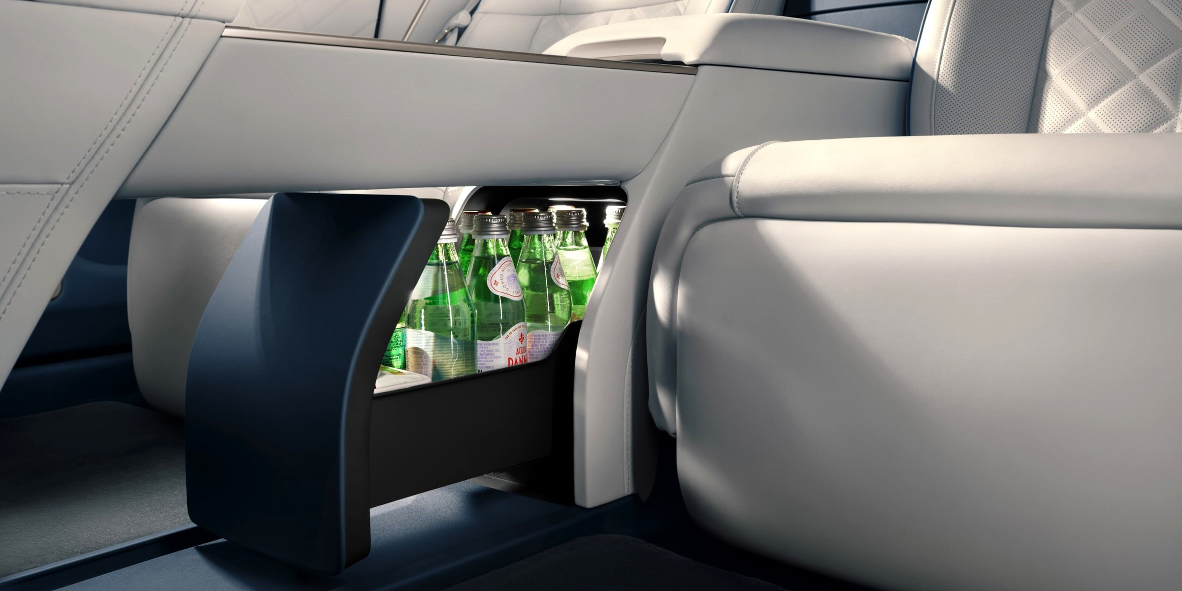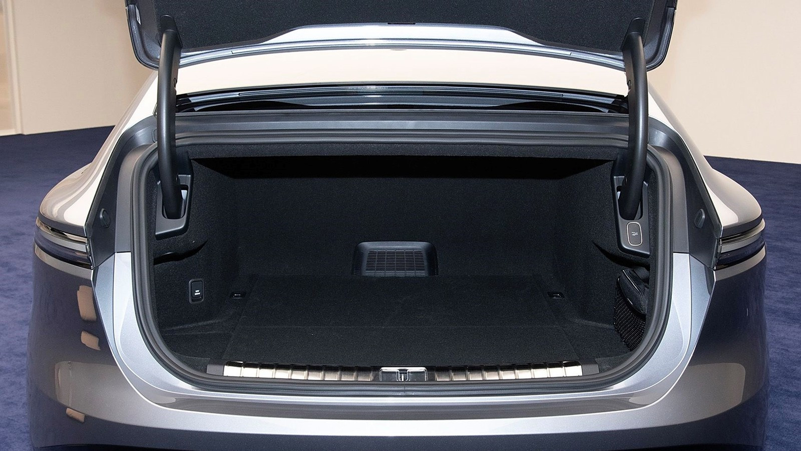 Задним пассажирами положены индивидуальные мультимедийные экраны с диагональю 14,5 дюйма и раскладные столики. На центральном тоннеле между задними креслами располагается сервисный 8-дюймовый экран и беспроводные зарядки для смартфонов, этажом ниже — охлаждаемый мини-бар. Штатная 2800-ваттная аудиосистема насчитывает 35 громкоговорителей. Объём основного багажника — 544 л, спереди есть дополнительный багажник объёмом 105 л.