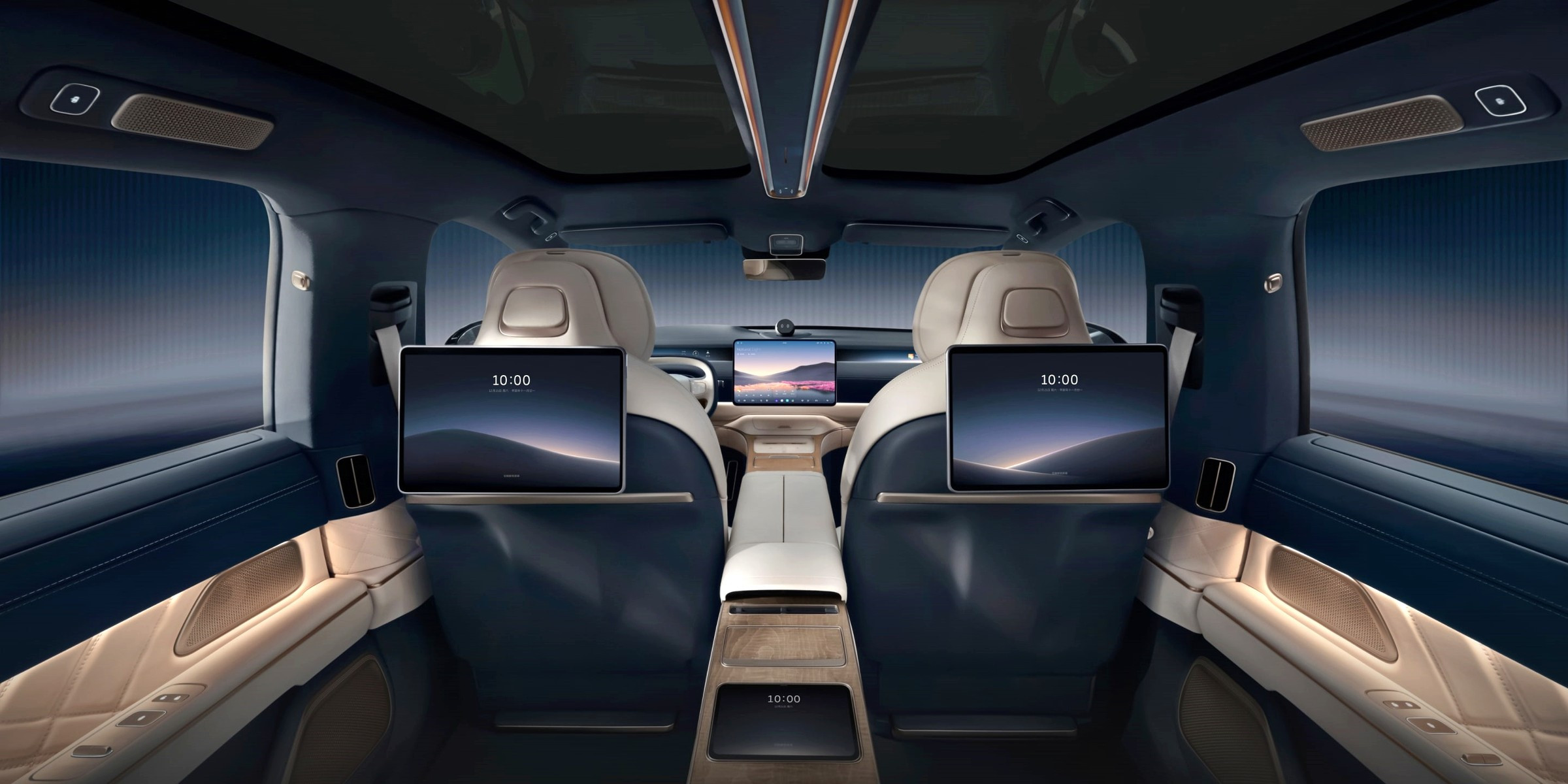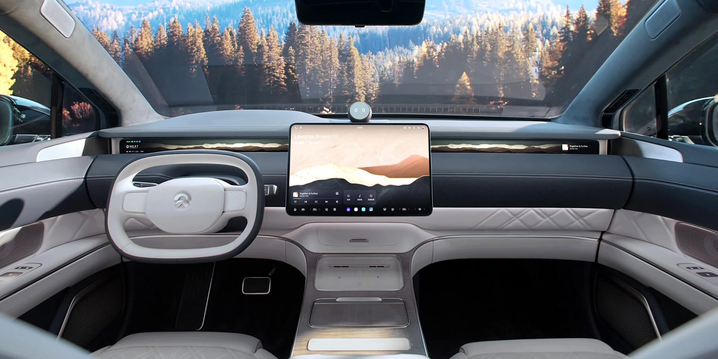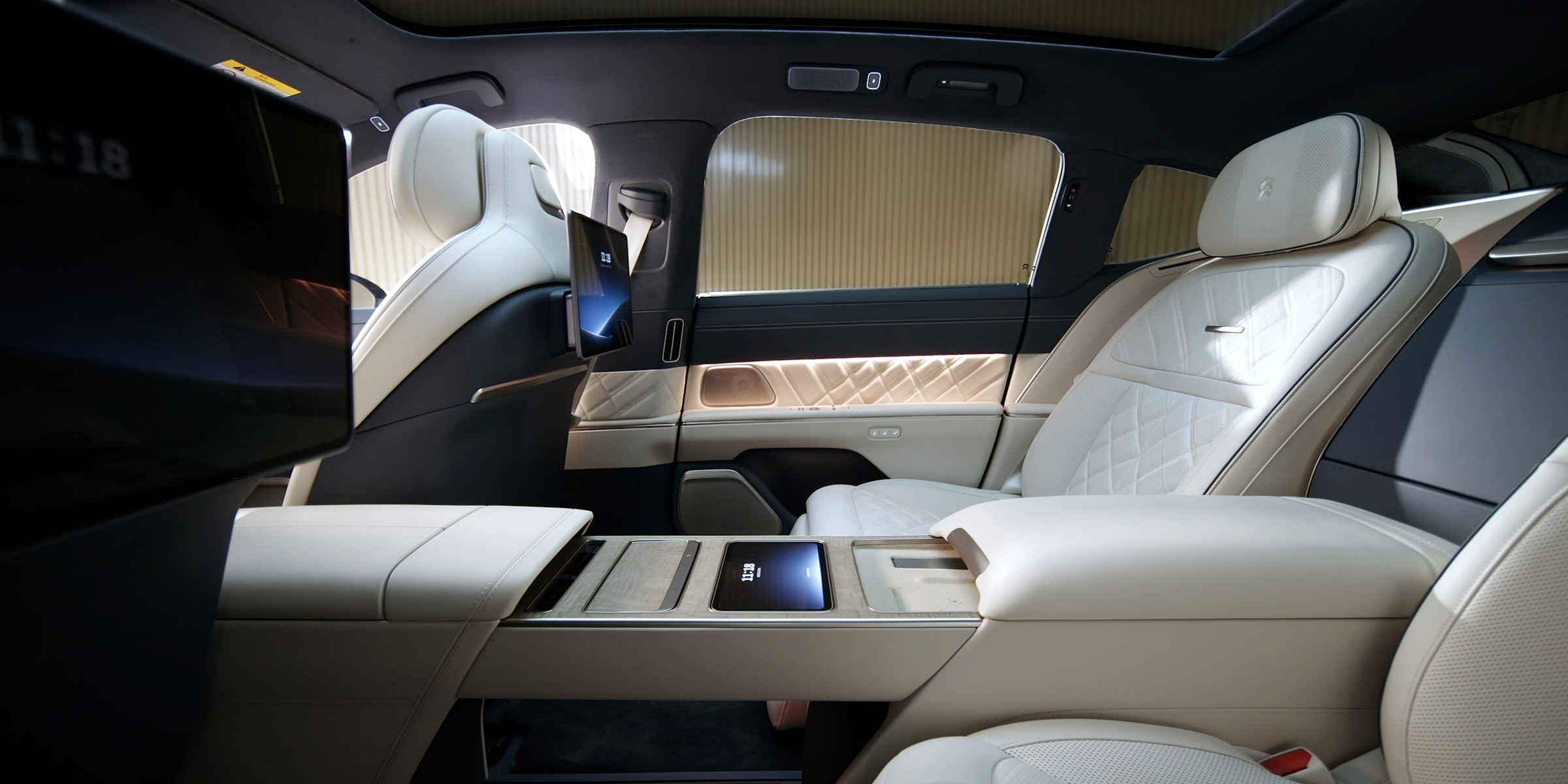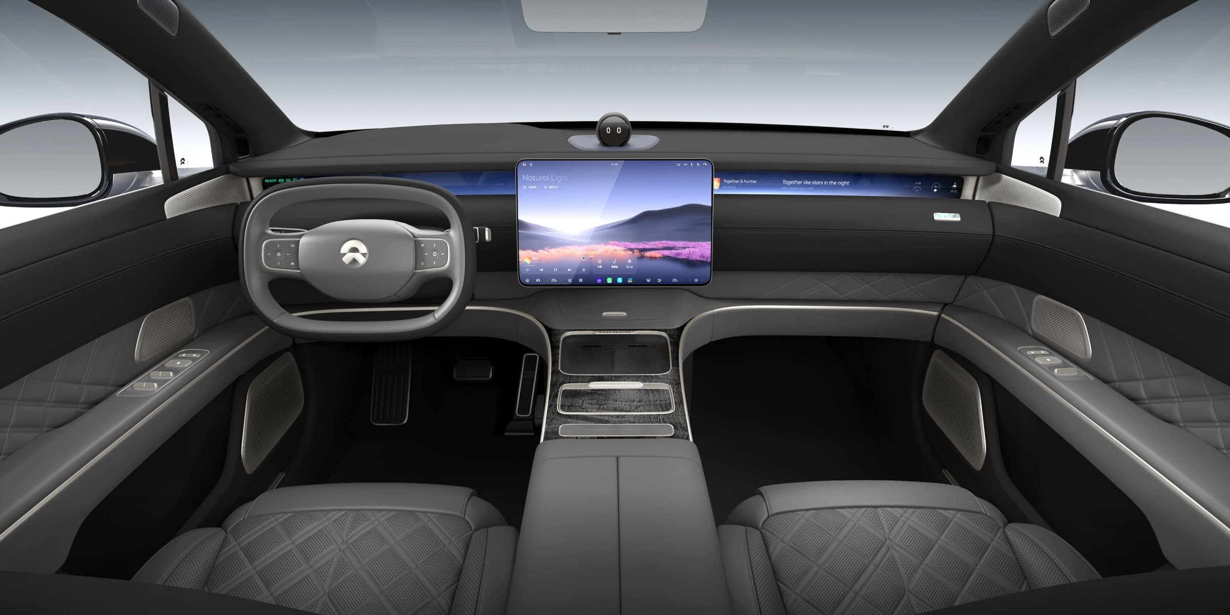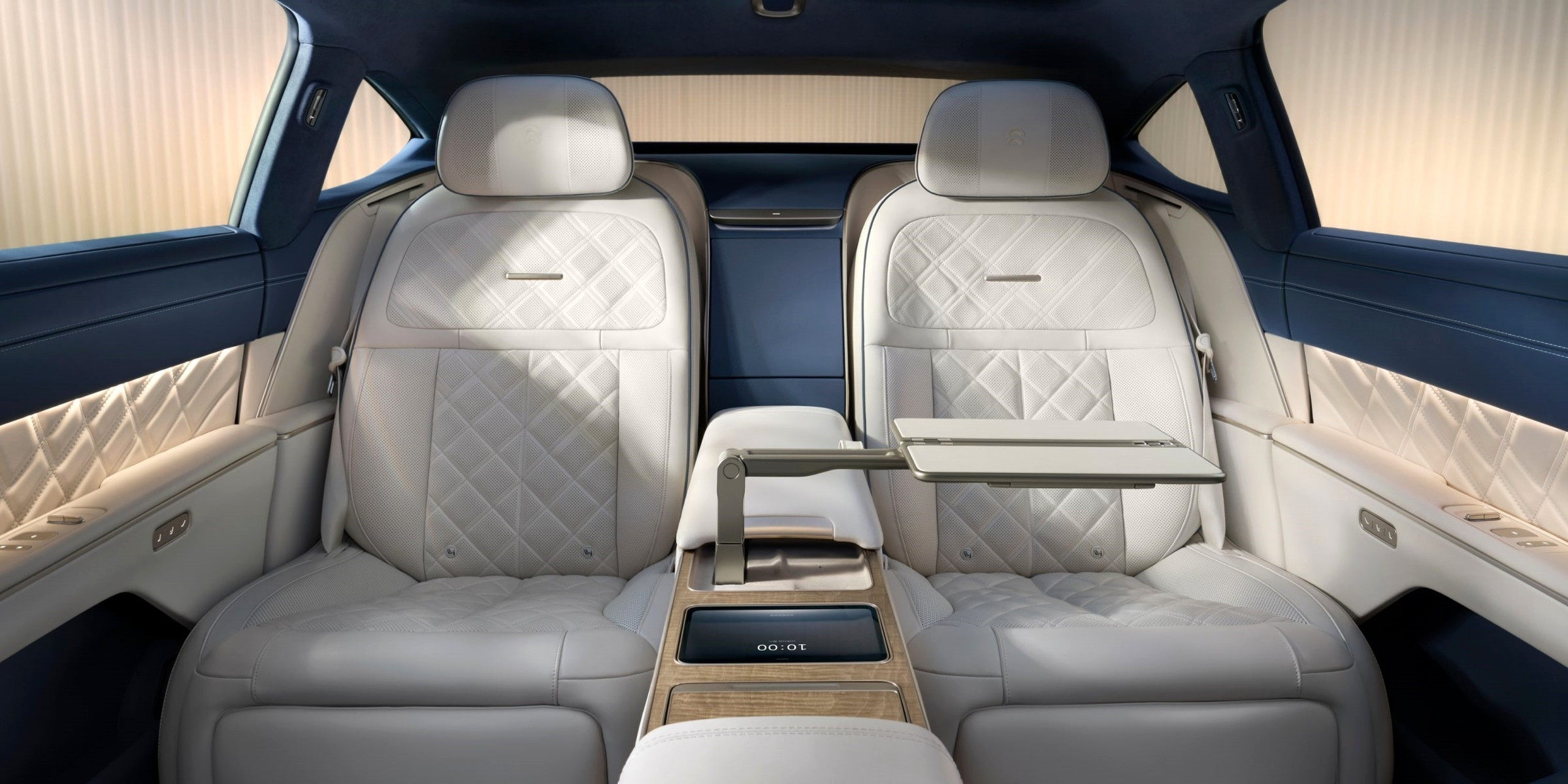 Салон у Nio ET9 строго четырёхместный, правые кресла отделены от левых высоким двухъярусным центральным тоннелем, все кресла оснащены подогревом, вентиляцией и массажёрами. Передняя панель оформлена так же лаконично, как у других моделей Nio, к её центру прикреплён 15,6-дюймовый настроечно-мультимедийный планшет, а над ним моргает глазками голова виртуального помощника Nomi. Все оперативные показания для водителя выводятся на экран дополненной реальности на лобовом стекле.