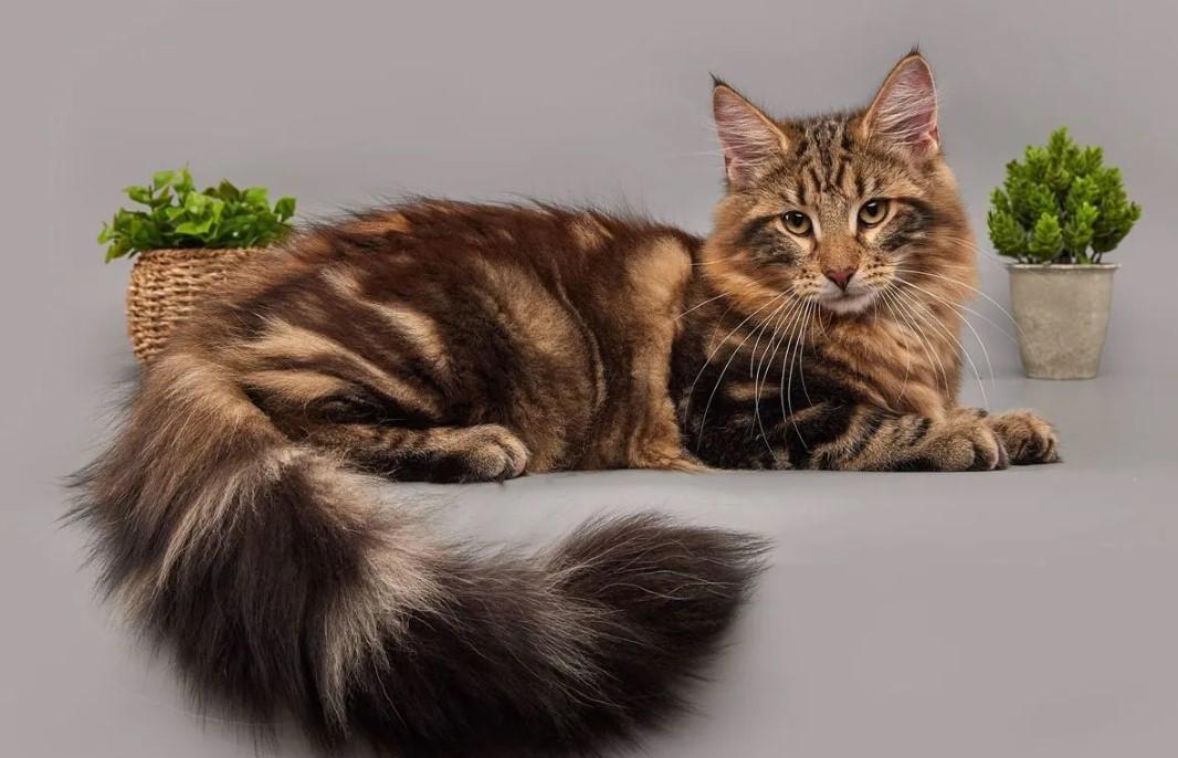 На фотографиях котенок выглядит фотогеничным. У него богатая шерсть, особенно хвост.