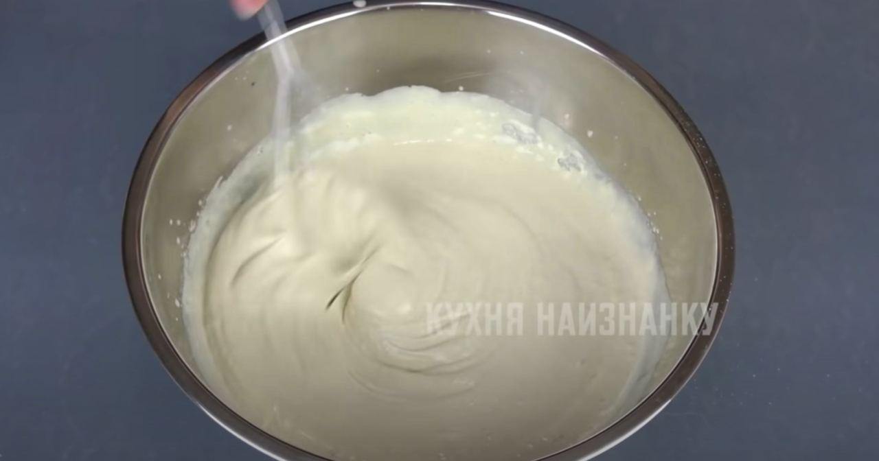 Перемешиваю всё ещё раз миксером и добавляю растопленное сливочное масло. Важно! Масло не должно быть горячим!