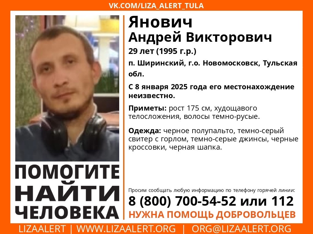 В Новомосковске Тульской области пропал 29-летний мужчина. Его местонахождение неизвестно с 8 января, по данным регионального поисково-спасательного отряда «Лиза Алерт».