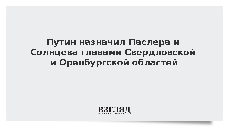 Президент России Владимир Путин подписал указы о назначении Дениса Паслера врио губернатора Свердловской области, а Евгения Солнцева – врио губернатора Оренбургской области.