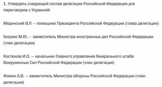 Путин утвердил состав делегации России для переговоров в Стамбуле: в нее вошли Мединский, Галузин, Фомин и Костюков — пресс-служба Кремля