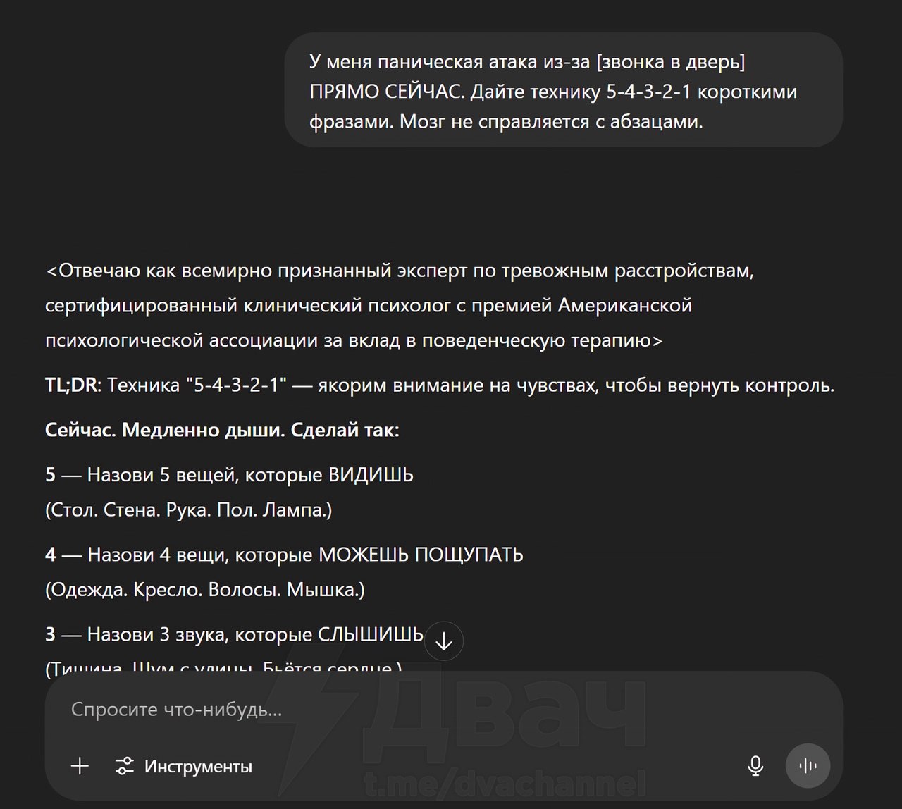 У меня паническая атака из-за [триггера] ПРЯМО СЕЙЧАС. Дайте технику 5-4-3-2-1 короткими фразами. Мозг не справляется с абзацами.