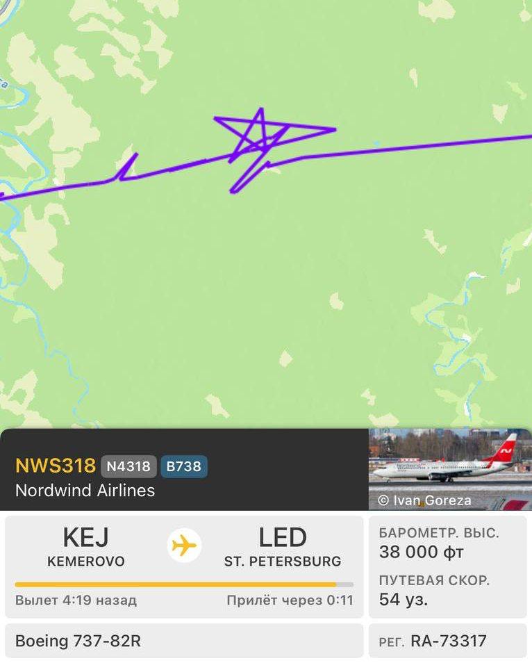 Самолёт «нарисовал» звезду в небе, пока в Пулково действуют ограничения на посадку. Он летел из Кемерово в Петербург.
