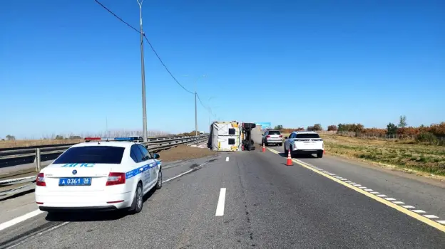 Авария произошла в 9:30. По предварительным данным, водитель не справился с управлением и наехал на барьерное ограждение, в результате чего большегруз опрокинулся. Полиция проводит проверку. Очевидцы выложили в Сеть кадры с места происшествия.