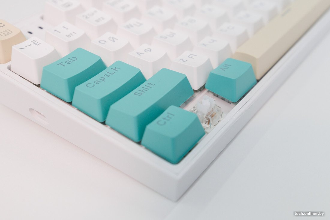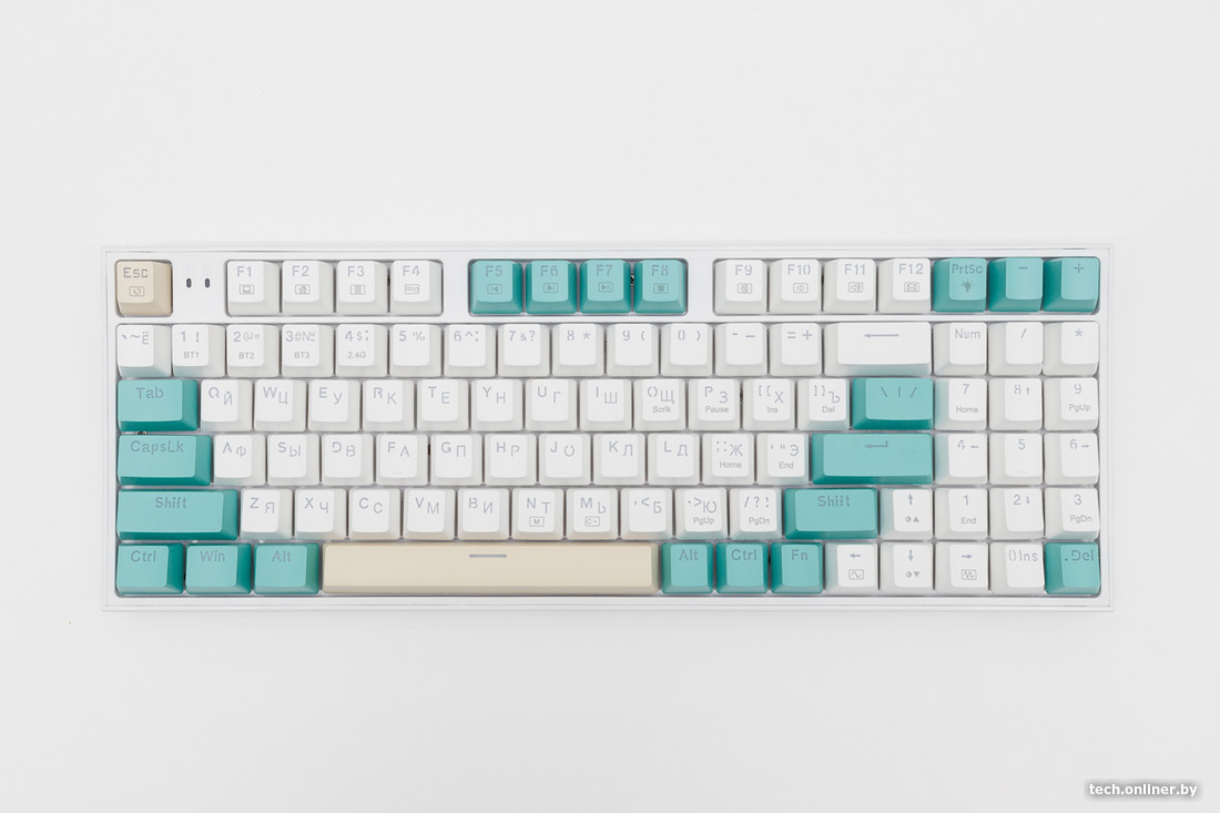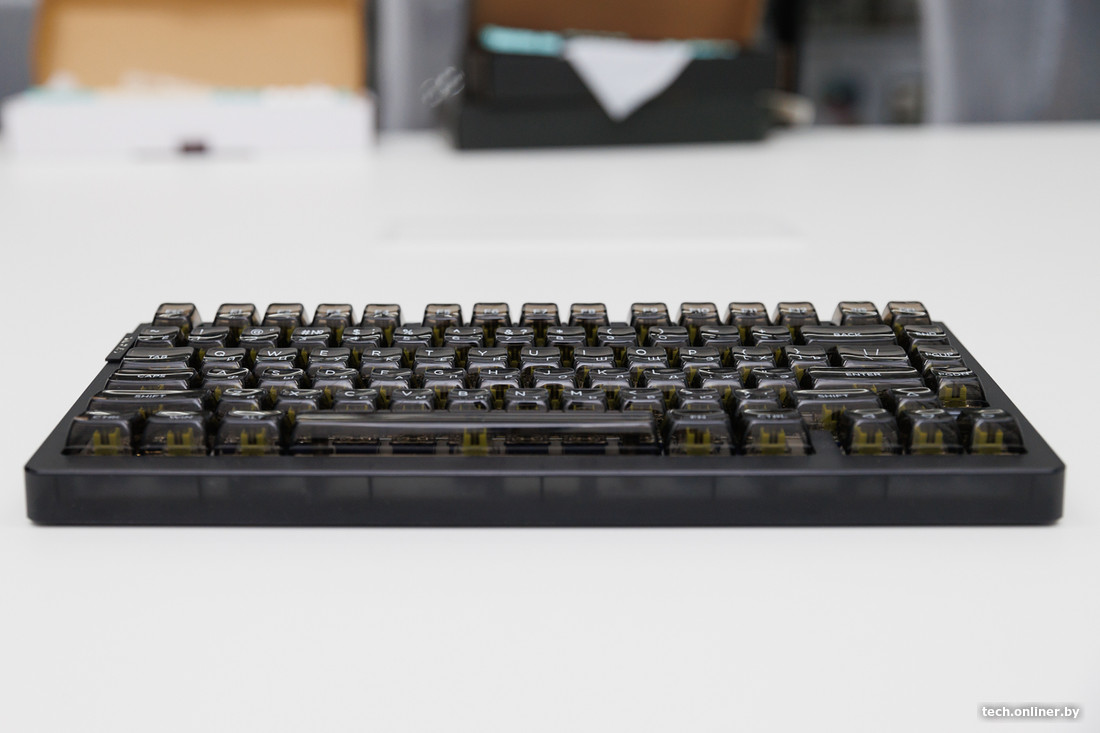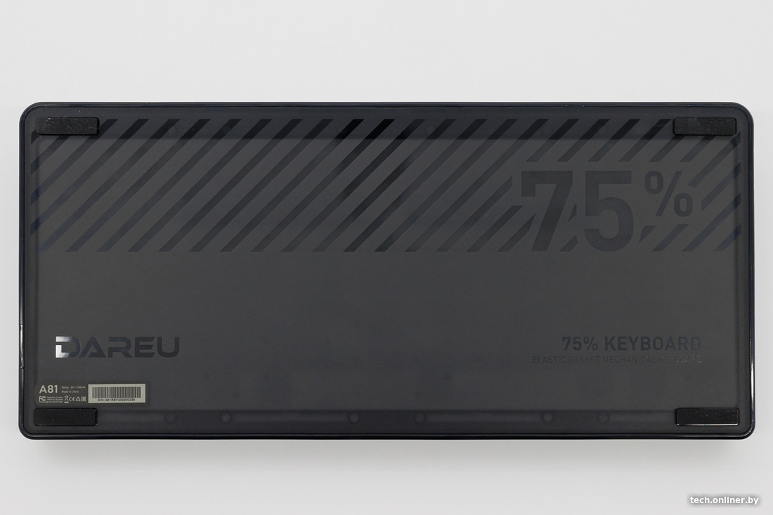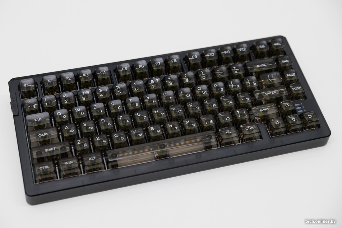Dareu A81 представляет собой компактную по размерам механическую клавиатуру в форм-факторе 75% (81 клавиша, без цифрового блока). Корпус полностью пластиковый, чуть гуляет по длинной оси, но без посторонних звуков. Клавиши полностью прозрачные, кириллица и латиница нанесены стандартными шрифтами, расположены привычно: вверху слева латиница, внизу справа — кириллица.