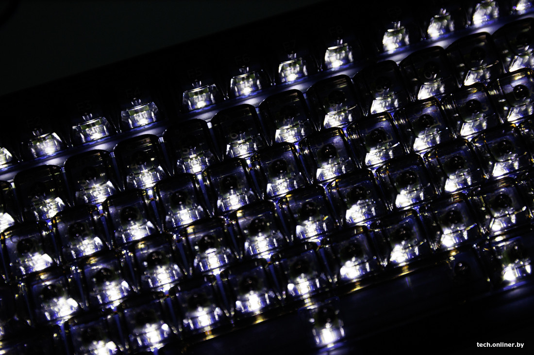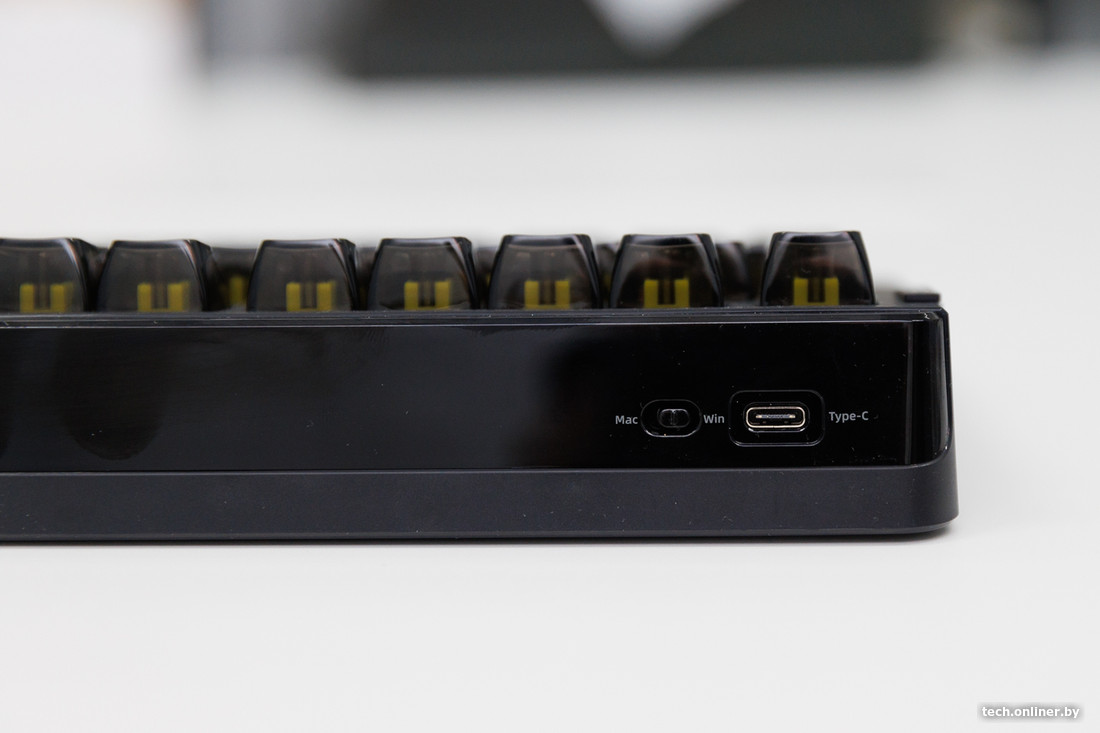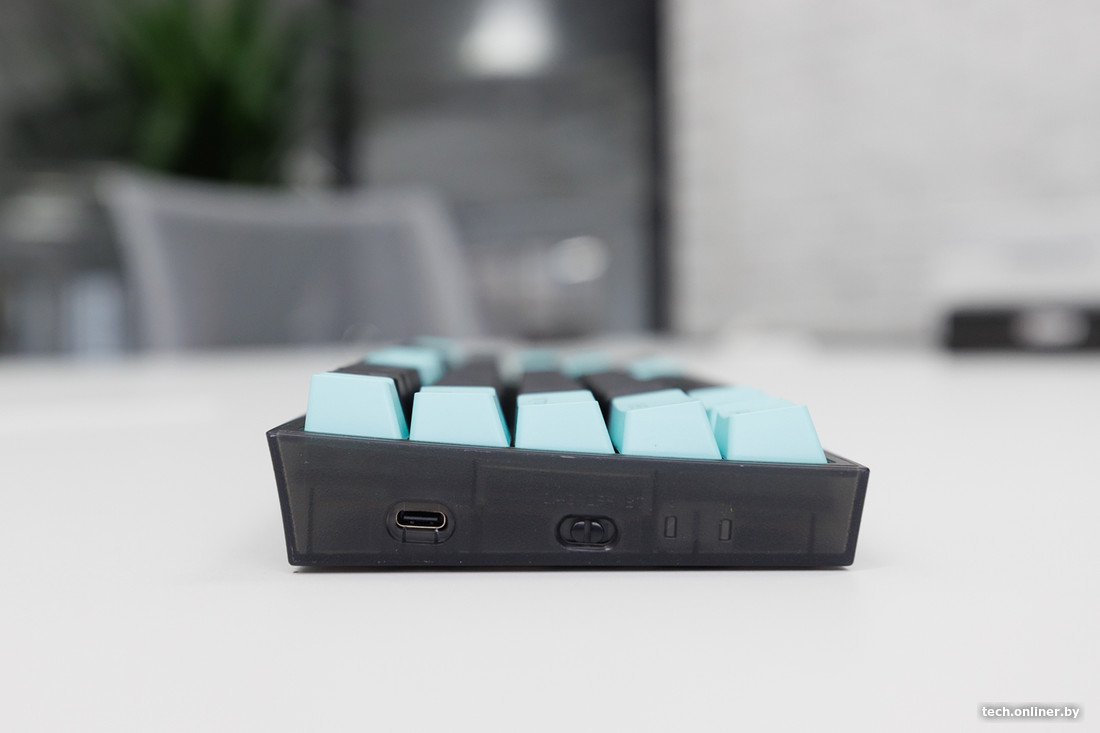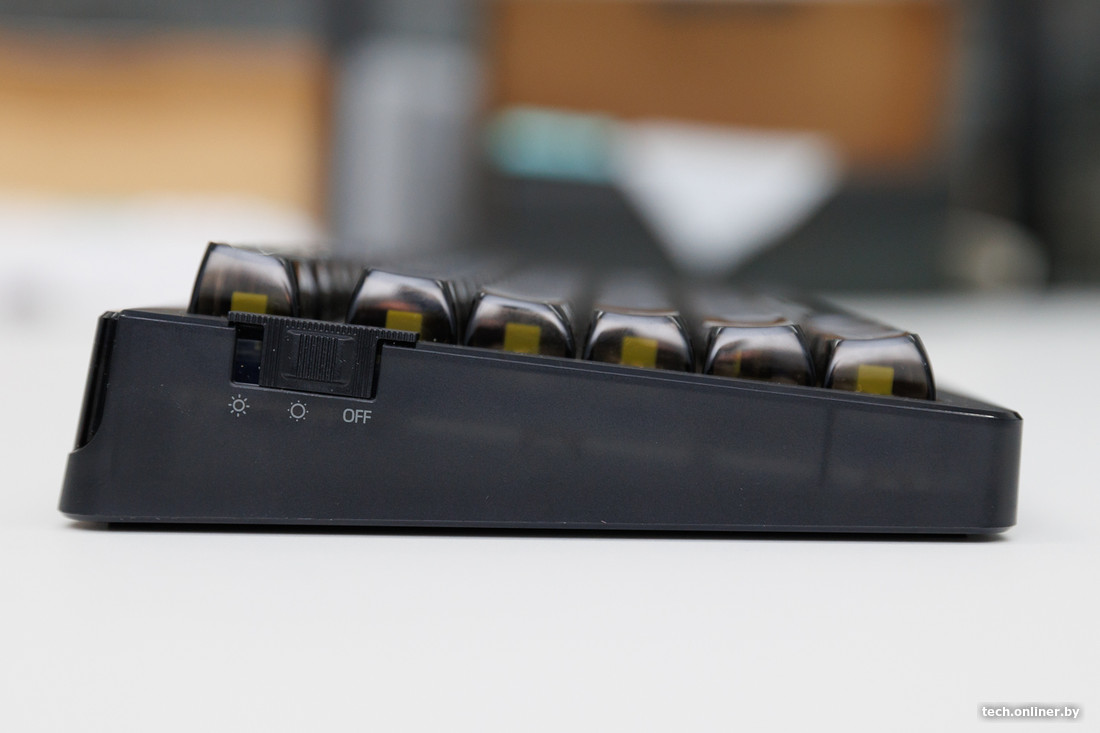 Слева на корпусе имеется переключатель, регулирующий подсветку: выключено, «волна» (медленно и не очень плавно гаснет и включается по кругу) и третий «все время включено». Первый удобен почти всегда, так как в двух других клавиатура превращается в панель со светодиодами и кнопками с невидимыми символами. При внешнем источнике света их еще можно разглядеть, в темноте они исчезают полностью. В общем, красиво, но бесполезно до момента перехода на непрозрачные кейкапы.