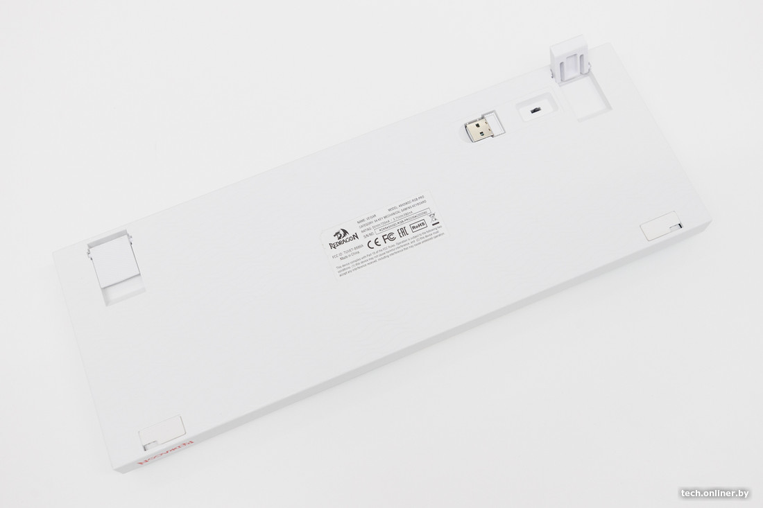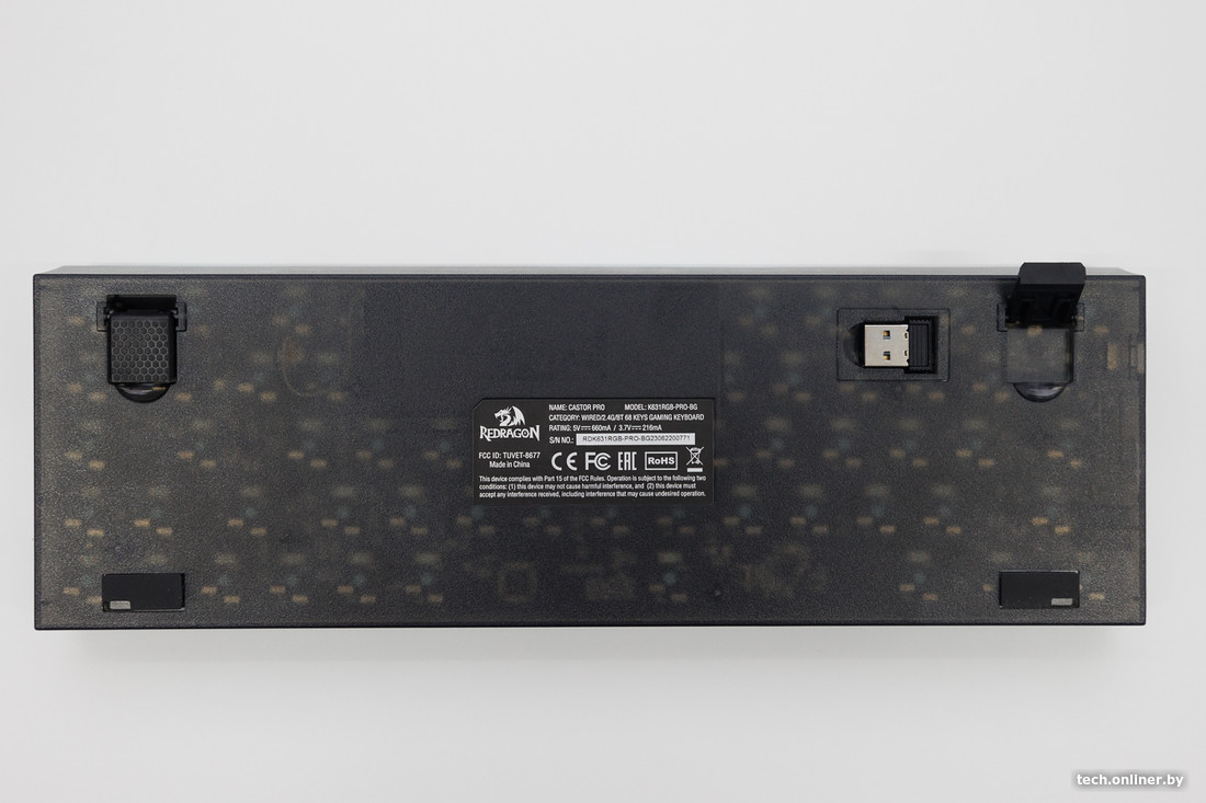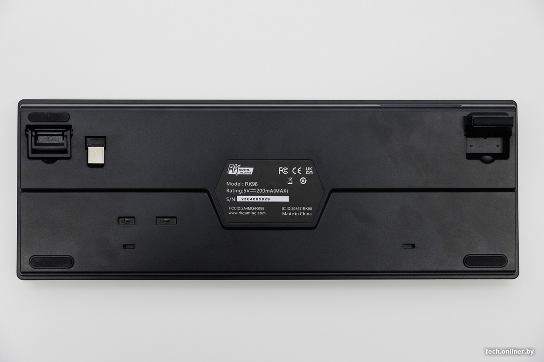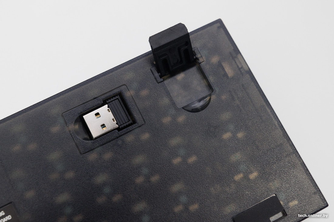 Подключается Royal Kludge RK98 к компьютеру через USB-кабель (как и у Castor Pro, это кабель с отсоединяемым разъемом USB-A и Type-C), радиоканал или Bluetooth. Радиомодуль, в отличие от клавиатур Redragon, крепится в полости магнитом и потому легко вынимается, не надо страдать, выковыривая его из паза. Может потеряться? Может быть, мы жестко трясли клавиатуру — не выпал.