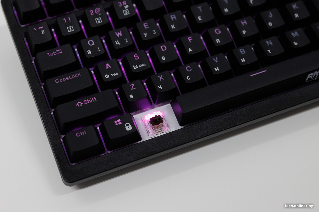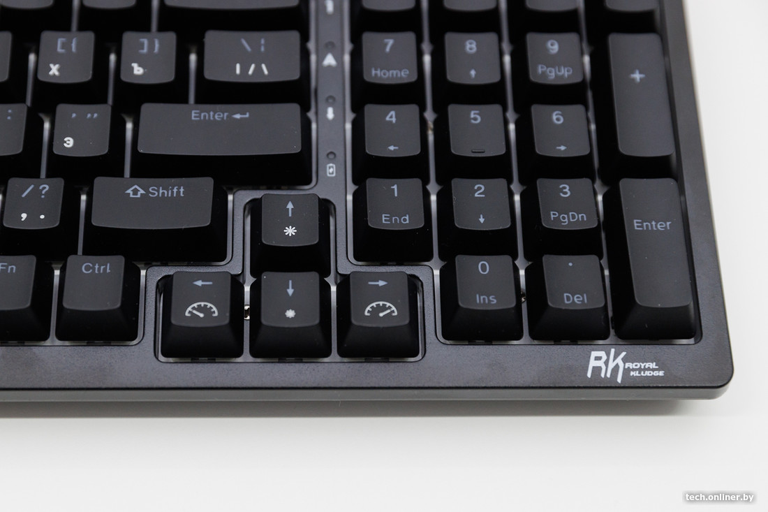 Корпус клавиатуры пластиковый, как у остальных, но не гуляет по осям. Шрифты нанесены немного «наоборот»: латиница по центру кнопок ближе к верхней части, кириллица — внизу слева более мелким шрифтом. Подсветка есть только у латиницы, кириллица нанесена на поверхность клавиш. Ход кнопок четкий, срабатывание происходит примерно в первой трети хода клавиш, но веселей барабанить до упора, пробелу при быстром наборе очень не хватает информативности. Но количество ошибок при наборе текста минимальное (чаще они связаны со «слишком» быстрыми нажатиями), работать и играть на Royal Kludge RK98 комфортно.