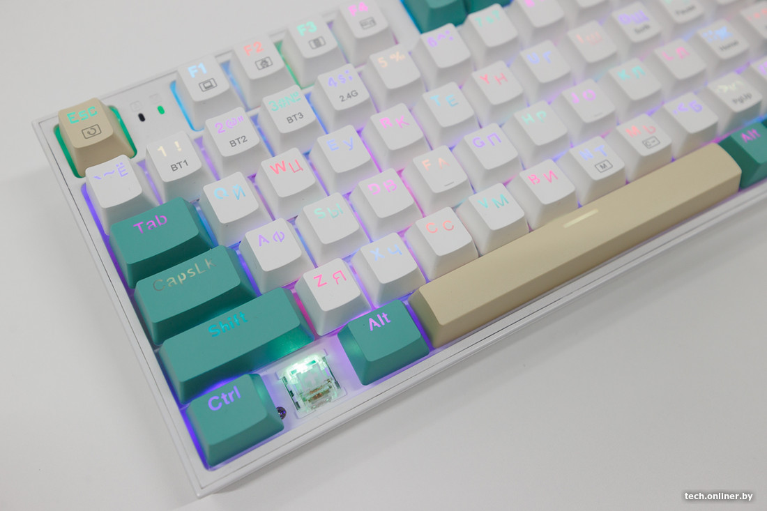 Первой на столе оказалась геймерская RGB-клавиатура бренда Redragon — Veigar. Форм-фактор 1800, или 90%, 94 клавиши: присутствует цифровой блок и F-кнопки, дополнительные функциональные клавиши действуют через кнопку Fn.