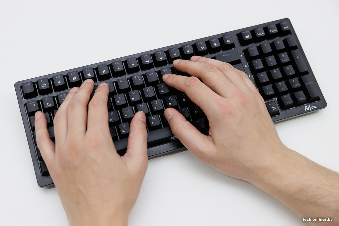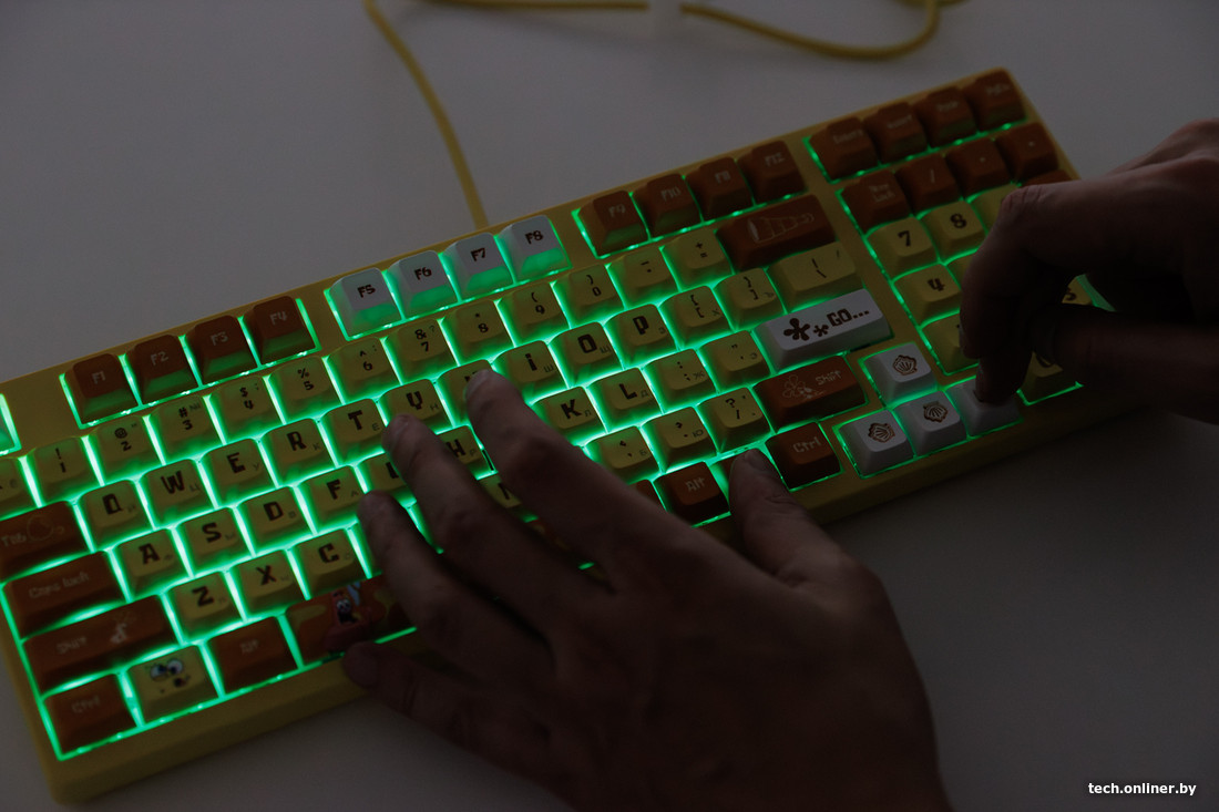 Губка Боб шумный, на клекот клавиатуры слетелись духи печатных машинок, а в ночи звуки призвали соседей, застучавших в стенку. В то же время, набирая текст, чувствуешь себя то ли хакером, то ли писателем. Пробел немного люфтит, однако нажимается точно и без пропусков в отличие от некоторых моделей выше. Набор текста в целом комфортен, хотя промахи по кнопкам случаются регулярно — вопрос то ли к кейкапам, то ли к алгоритму срабатывания свитчей. Как игровая клавиатура работает хорошо, как рабочая — много бубнит.