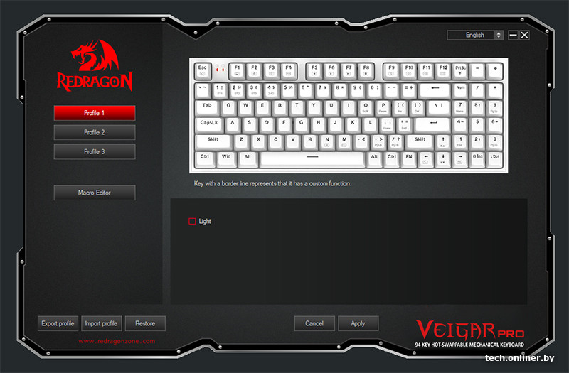 Для работы клавиатуры не требуется дополнительное ПО, но с сайта производителя можно скачать фирменную утилиту, чтобы настроить макросы и переназначить кнопки. Здесь же можно поиграть с настройками подсветки. Работа фирменной утилиты возможна только при проводном подключении (так снижается вероятность превратить клавиатуру в «кирпич», аналогично и у всех остальных устройств ниже).