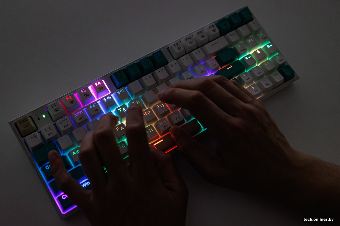 С точки зрения работы с этой клавиатурой вопросов не возникло. Более того, набирать текст на ней комфортнее, чем на двух выше: она негромкая, находится где-то между Redragon Veigar и Castor Pro, звук мягкий, приглушенный, разве что пробел шумноват, чуть люфтит и малоинформативен. Ход остальных клавиш четкий, но в играх хотелось бы чуть понятнее обратную связь. Количество «сбоев» — опечаток и пропущенных нажатий — стремится к нулю, по крайней мере, при подключении через провод.