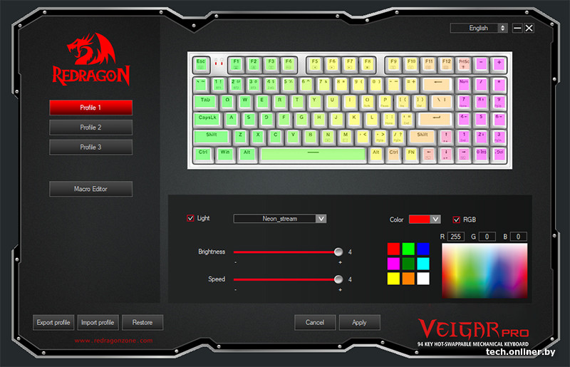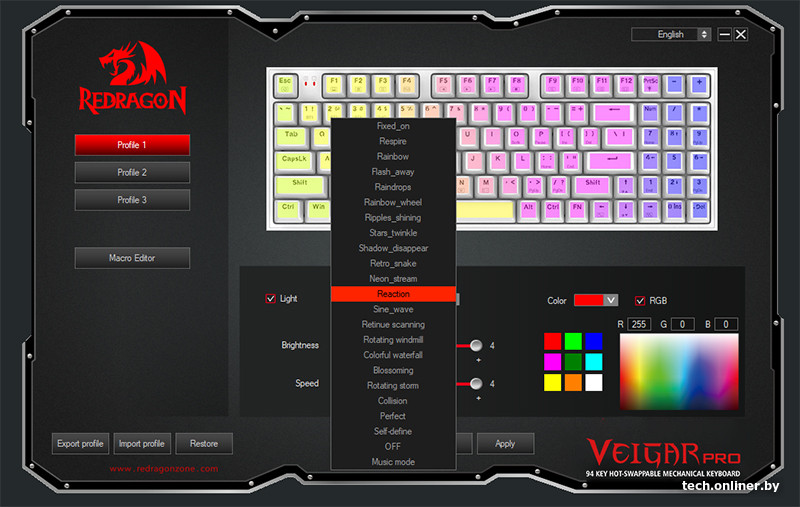 И вновь для работы не требуется дополнительное ПО, но утилиту для настройки установить можно (с тем же набором возможностей, что у Veigar, программа не универсальная, нужна новая). Тип и интенсивность RGB-подсветки регулируются через Fn в паре со стрелками и пробелом, который включает или отключает «светомузыку», имеется выделенная клавиша для записи макросов без дополнительного ПО.