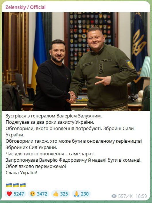 Новым главкомом ВСУ становится Александр Сырский. Главная интрига - это предложение Залужному "остаться в команде". Из контекста ясно, что это не командование ВСУ.