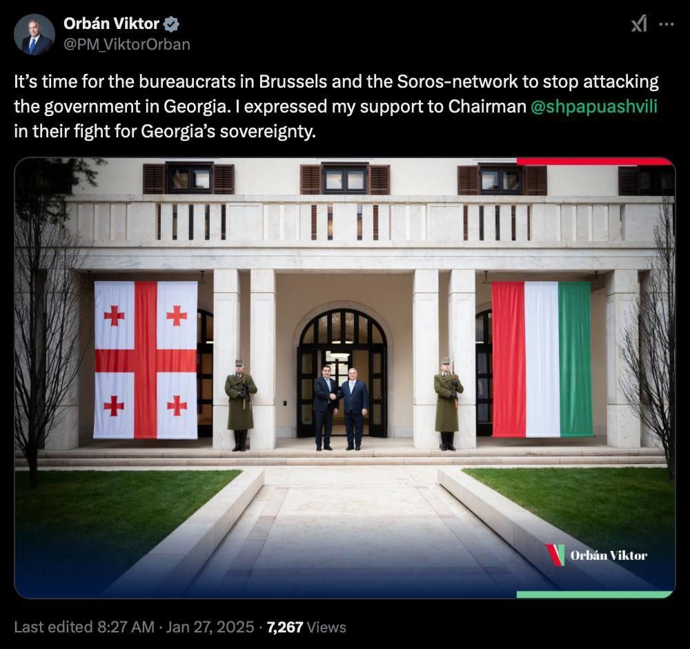 Премьер Венгрии Орбан: "Пора бюрократам в Брюсселе и сети Сороса прекратить нападать на правительство Грузии. Я выразил свою поддержку председателю парламента Папуашвили в их борьбе за суверенитет Грузии".
