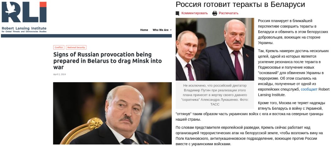 Американская НПО “Институт Роберта Лансинга” (Robert Lansing Institute) опубликовал статью, в которой заявляет о намерении России совершить в ближайшее время теракты в Беларуси и обвинить в этом полк Калиновского, воюющего на стороне Украины. Сообщается, что одной из целей провокации является усиление резонанса после теракта в подмосковном “Крокусе” и получение новых оснований для обвинения Украины в терроризме. Институт якобы ссылается на представителя европейской разведки. Эту публикацию массово начали распространять украинские СМИ.