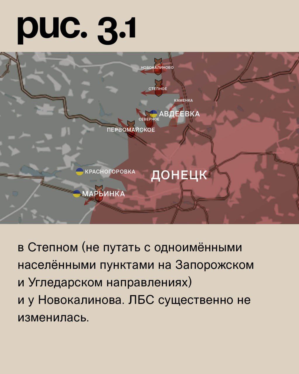 На Донецком фронте ВС РФ при поддержке средств дальнего поражения атаковали в Марьинке, у Первомайского, Северного (населённый пункт к западу от Авдеевки), в промзоне юго-западнее Авдеевки, со стороны Каменки, в Степном (не путать с одноимёнными населёнными пунктами на Запорожском и Угледарском направлениях) и у Новокалинова. ЛБС существенно не изменилась. (Рис. 3)