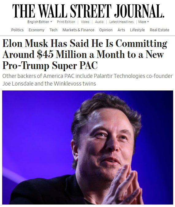 Илон Маск планирует выделять около $45 млн долларов в месяц на поддержку президентской кампании Дональда Трампа