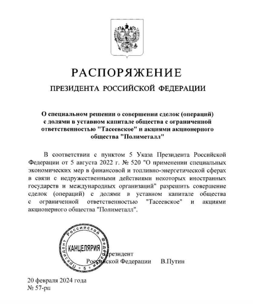 ❗️Путин разрешил продажу акций крупнейшего производителя серебра и золотодобытчика Polymetal — российские активы бизнеса будут проданы отечественной компании
