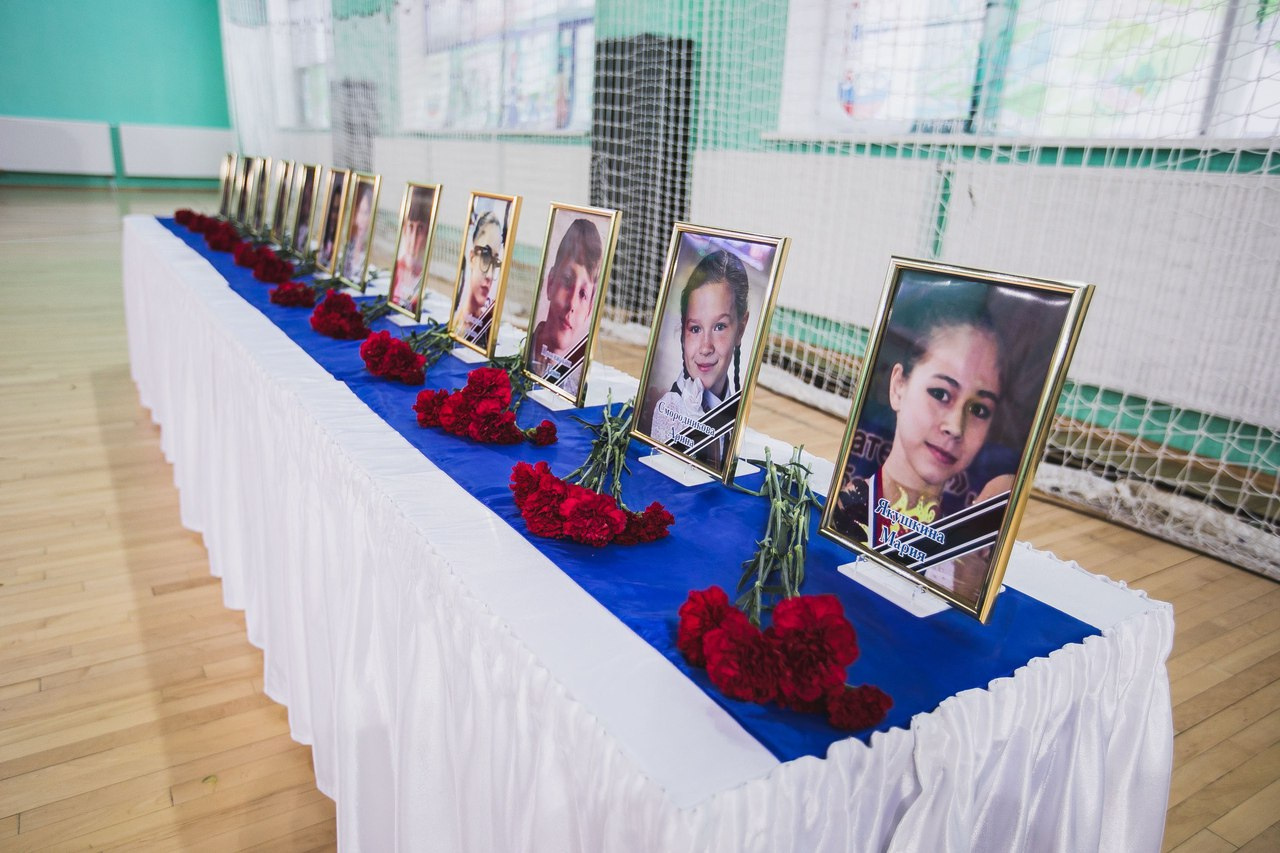Цветы, слезы, слова соболезнования. На прощание с погибшими пришли более 50 тысяч человек, это почти половина города. Церемония проходила в самом большом спортивном зале Нефтеюганска. Она длилась больше трех часов. Люди все шли и шли. Многие или были знакомы с погибшими или знали родственников. В тот день город утопал в слезах. Среди погибших — восемь девочек и два мальчика. Самому младшему из ребят только исполнилось восемь лет, старшей было 16.