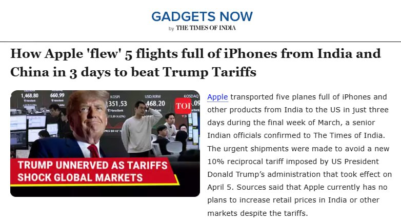 Всего за три дня в конце марта производитель электроники вывез пять полных самолётов со смартфонами, компьютерами и прочей техникой с заводов в Индии и Китае, пишет The Times of India.
