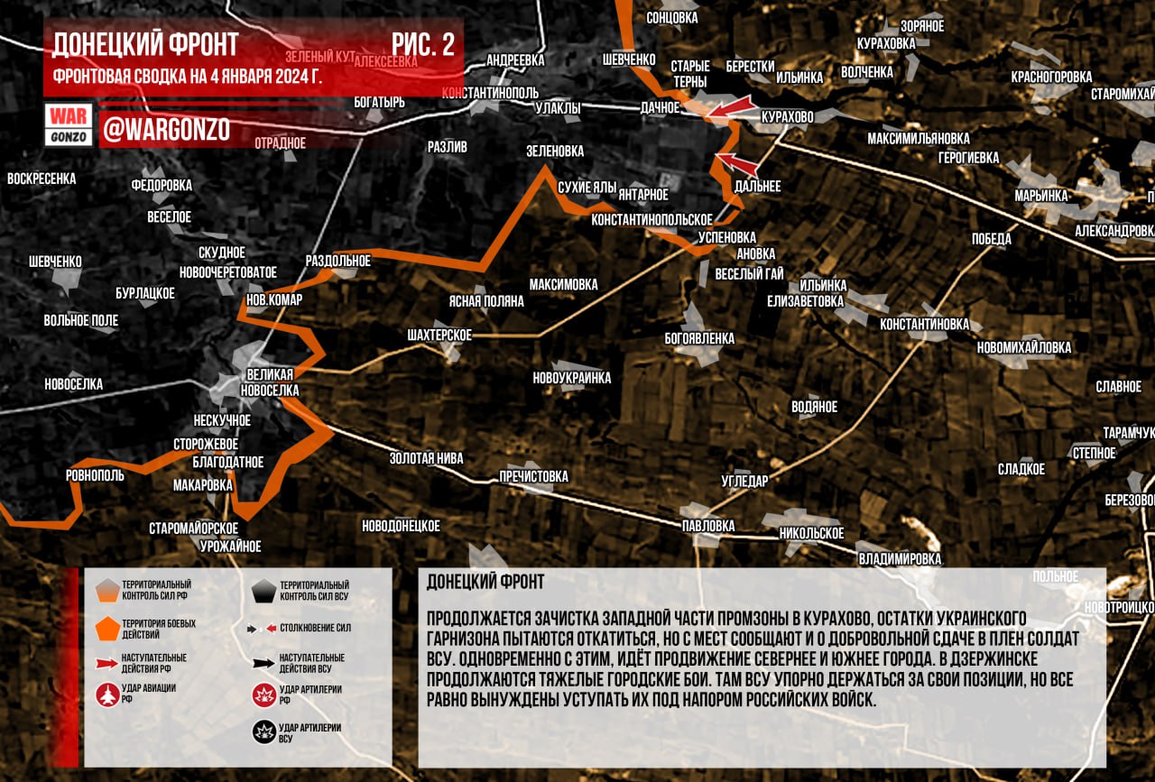 Донецкий фронт. Продолжается зачистка западной части промзоны в Курахово, остатки украинского гарнизона пытаются откатиться, но с мест сообщают и о добровольной сдаче в плен солдат ВСУ. Одновременно с этим, идёт продвижение севернее и южнее города. В Дзержинске продолжаются тяжелые городские бои. Там ВСУ упорно держаться за свои позиции, но все равно вынуждены уступать их под напором российских войск.