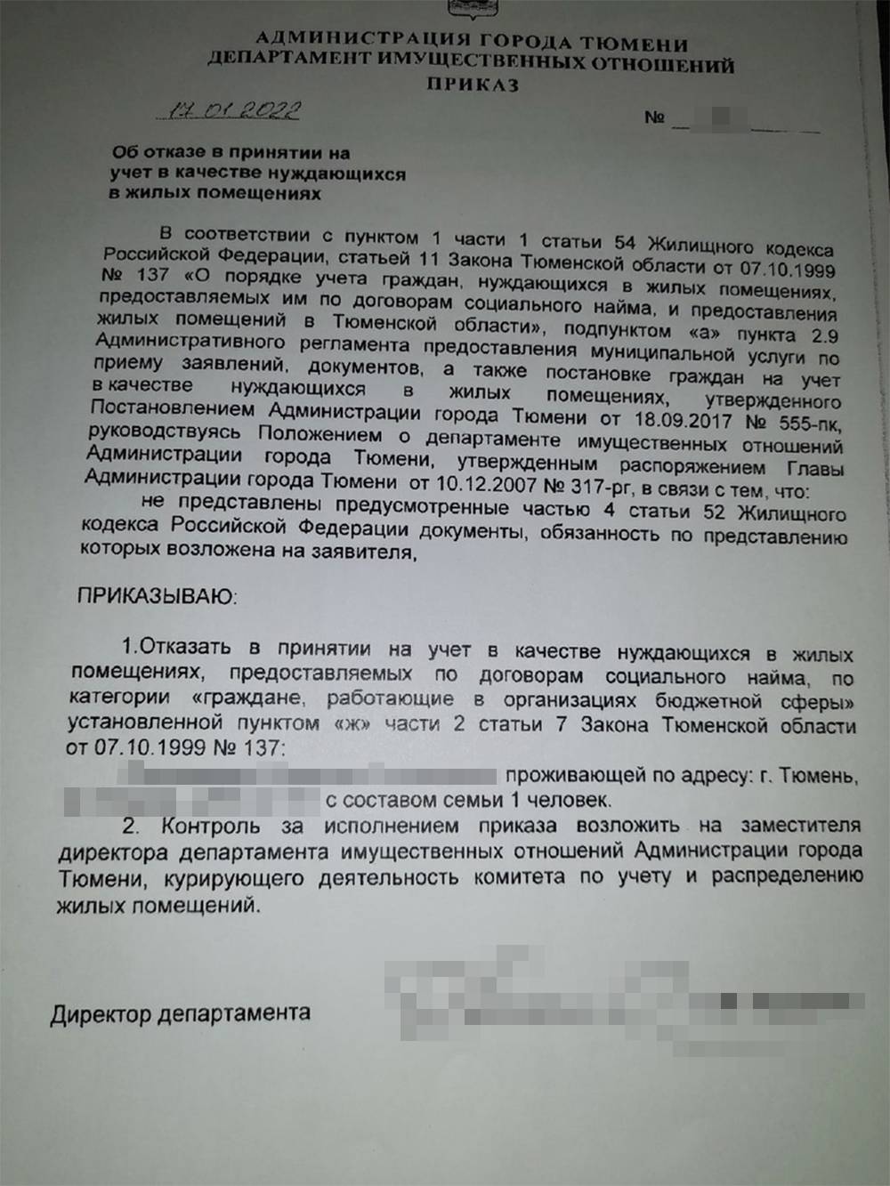 В декабре 2021 года я взяла справку в отделе кадров о том, что работаю в поликлинике, и пошла оформлять льготу. Но сделать это с первой попытки не удалось. Примерно через месяц из департамента имущественных отношений пришел отказ. Ведомство не устроила формулировка в справке: нужно было указать, что я не стою в очереди на жилье и не получала других выплат, которые связаны с улучшением жилищного вопроса. Ни того ни другого указано не было.