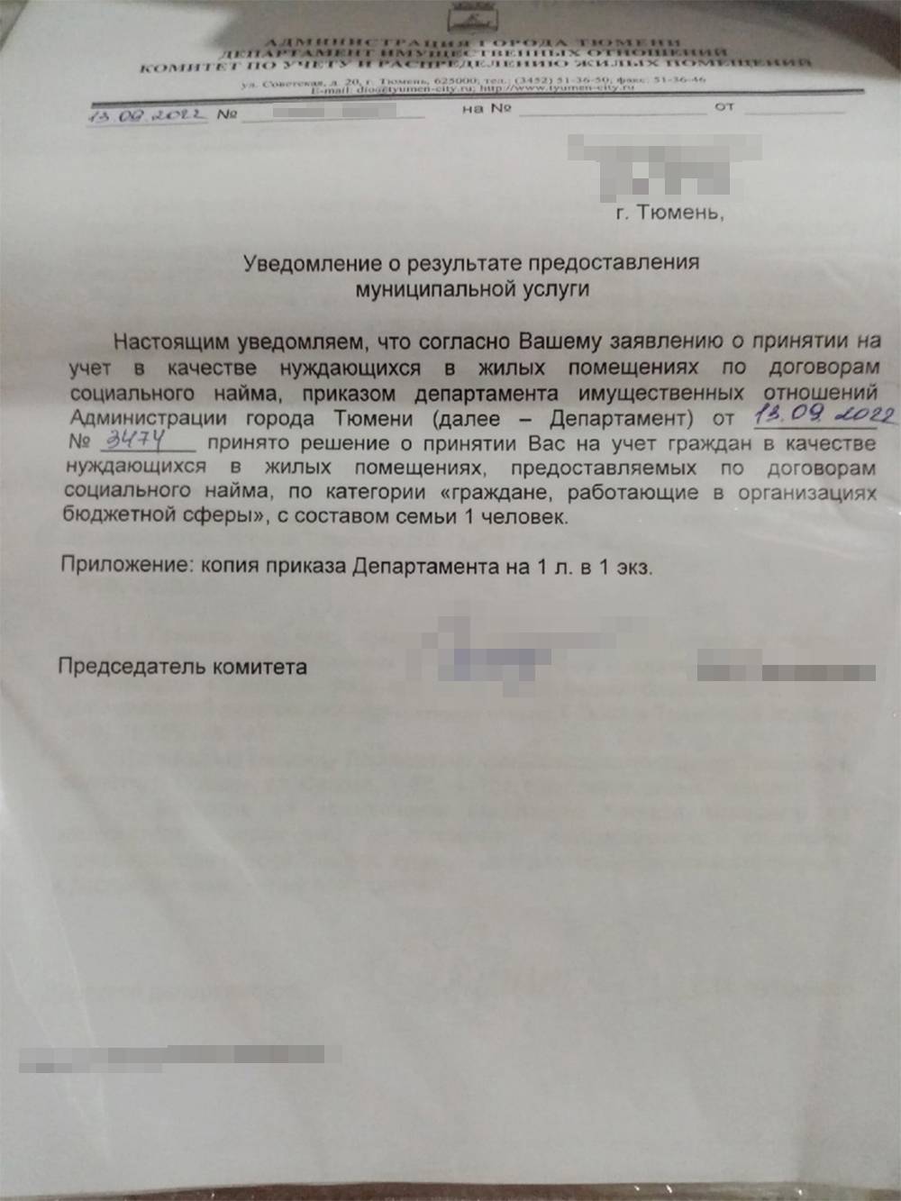 В начале сентября 2022 года я дословно продиктовала кадровику, что указать в справке, и настояла, чтобы ее подготовили в нужном мне виде. В этот раз все прошло успешно — в конце месяца я получила уведомление из департамента о том, что меня поставили в очередь бюджетников с номером 811. Не было известно, когда я получу жилье, но на выплату можно было рассчитывать спустя десять лет работы в поликлиниках региона.