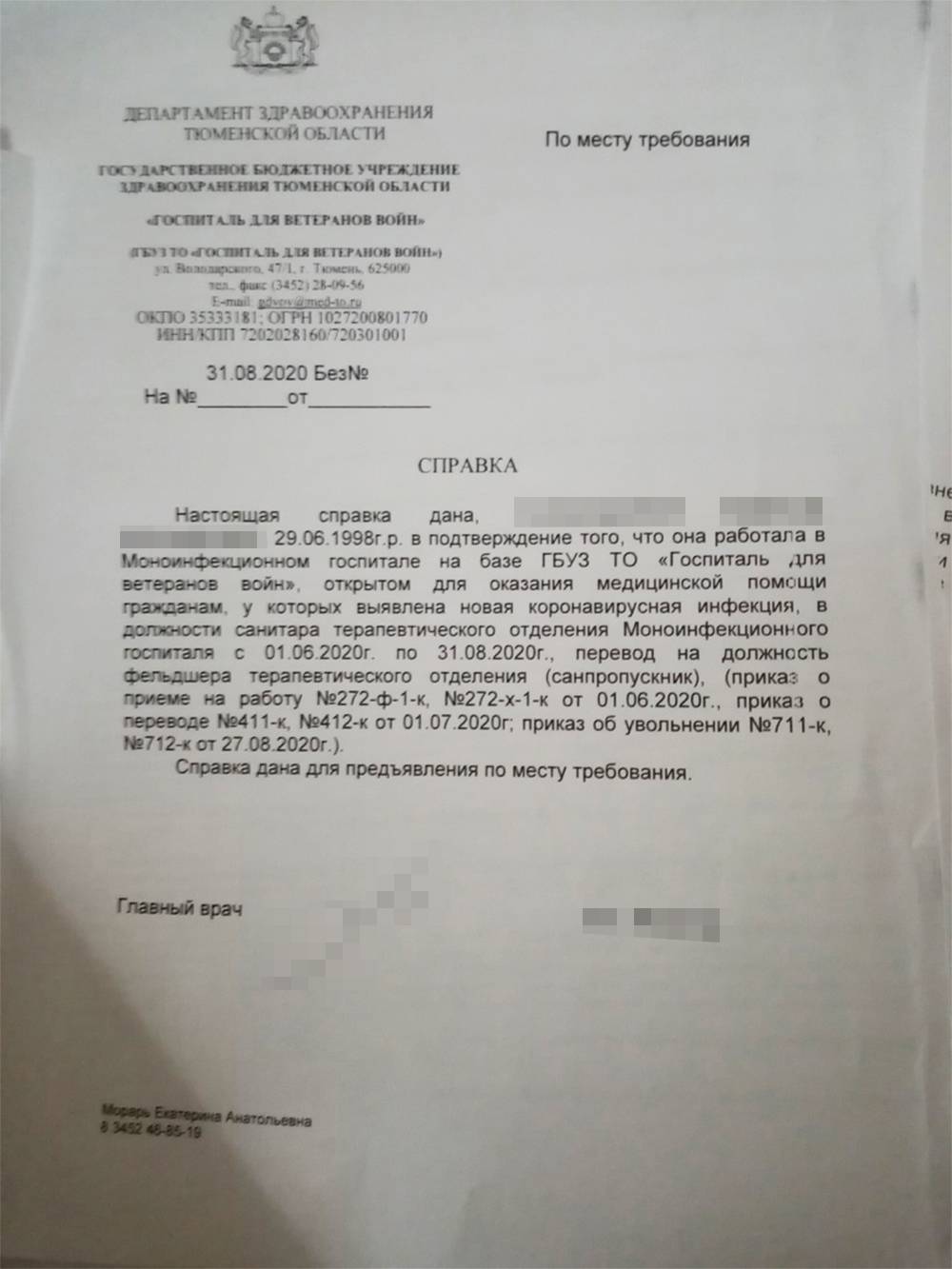 До конца октября я сидела без работы и решила сама позвонить в региональный департамент здравоохранения, чтобы узнать о вакансиях фельдшеров. Мне посоветовали позвонить в моногоспиталь «Надежда», который открылся на базе санатория, чтобы разгрузить постоянные госпитали. Там не хватало персонала, и мне сразу предложили место медсестры.