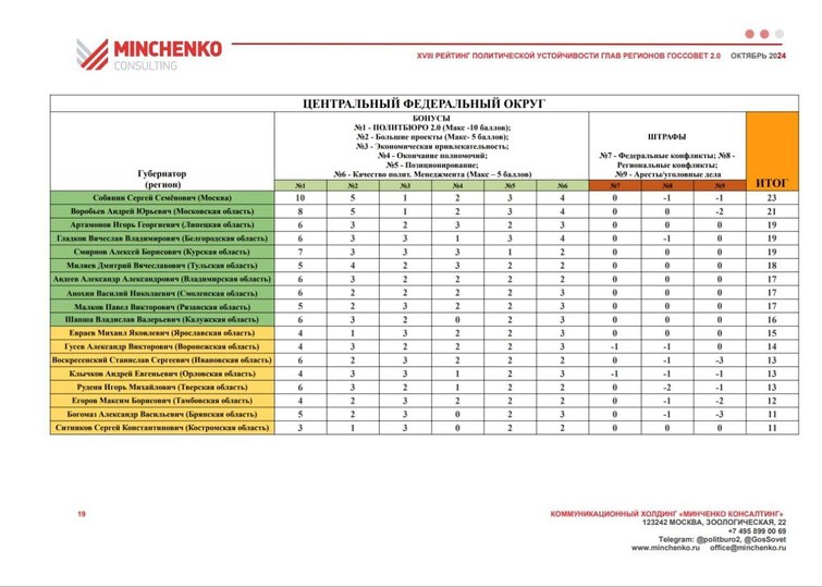 Стоит отметить, что лидер Липецкой области не ушел в минус ни по одному из пунктов. У Артамонова 19 баллов.