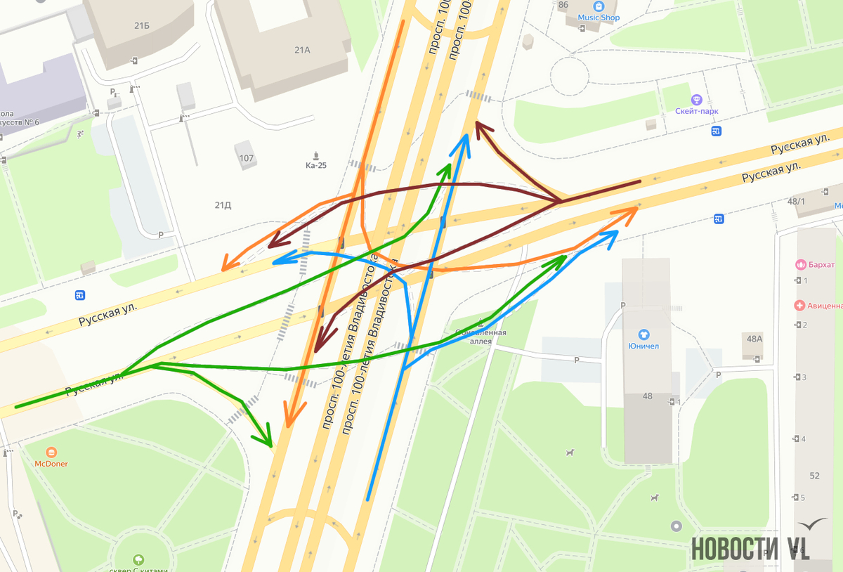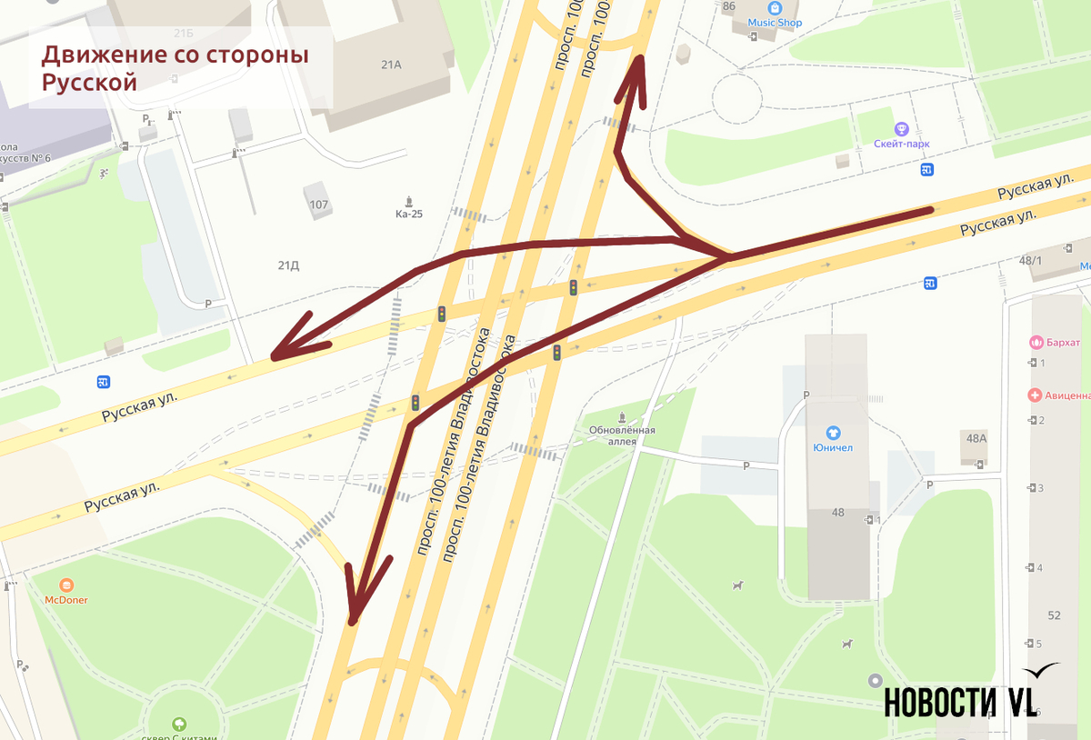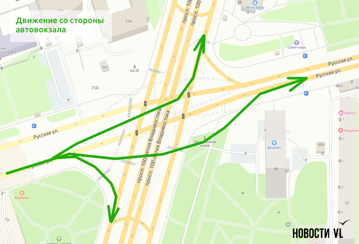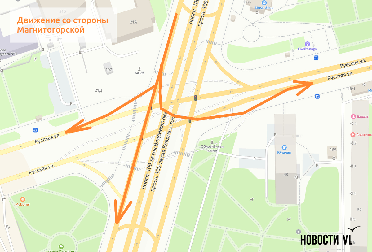 В первый день движения по новой схеме на перекрёстке Русской и проспекта 100-летия Владивостока творилась неразбериха. Утром все стояли в пробках, а к вечеру дороги опустели, как будто большинство водителей решили не ехать в этот район от греха подальше. ЦОДД опубликовал видеоинструкцию – как проехать перекрёсток, пока работы не завершены и нет разметки.