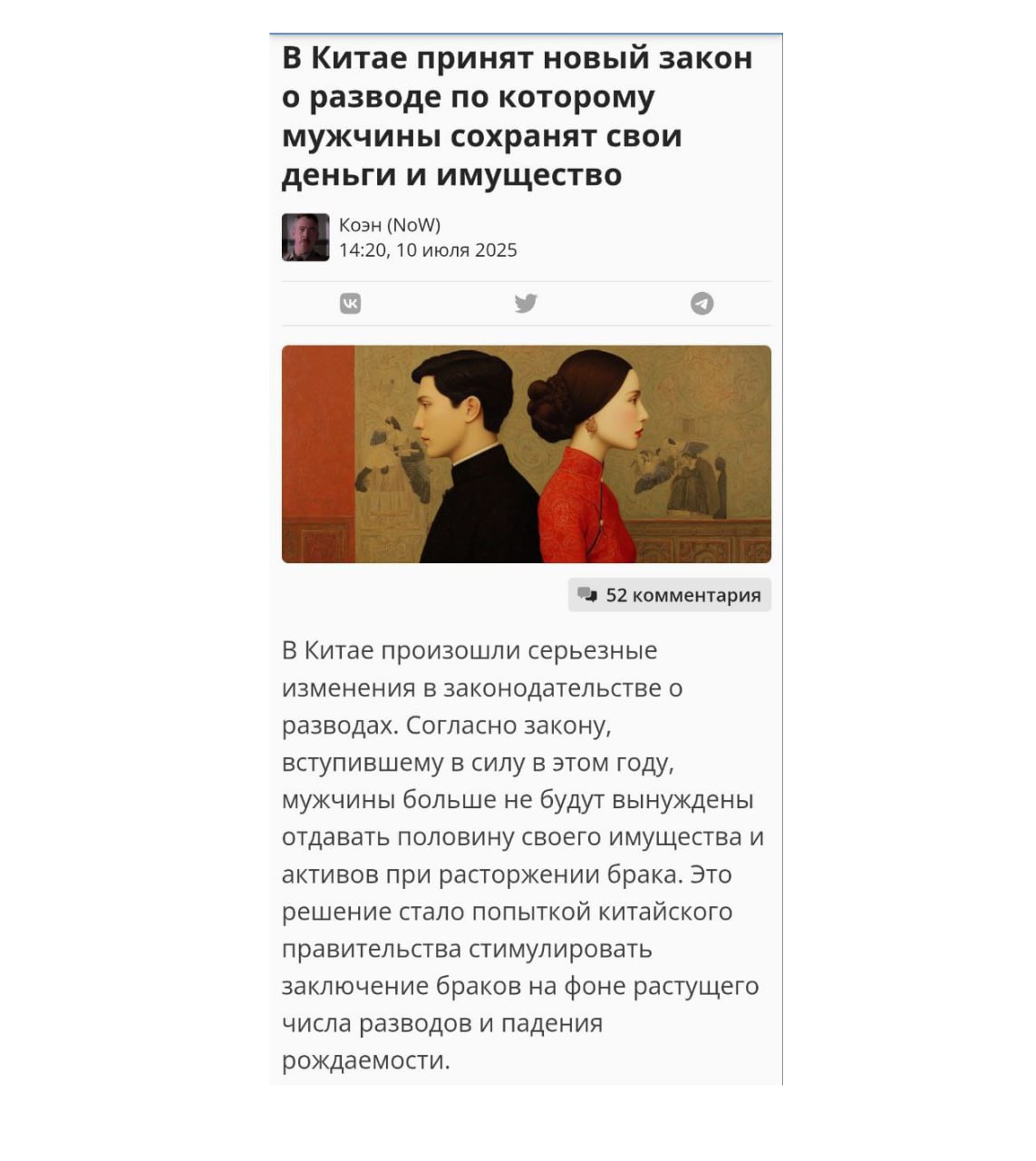 В Китае приняли закон при котором мужчина при разводе не отдает половину всего. При разделе имущества после развода, приоритет будет отдаваться финансовому вкладу каждого из супругов. Если жена не вносила прямой финансовый вклад в покупку недвижимости или других активов, то она может не получить доли при разводе, даже если вела домашнее хозяйство и воспитывала детей. Издание China Observer отмечает: Нигде женщины не смотрят на мужчин свысока так, как в Китае. Нигде женщины не требуют такого высокого выкупа за невесту. Нигде так много женщин не бросают своих мужей и детей.