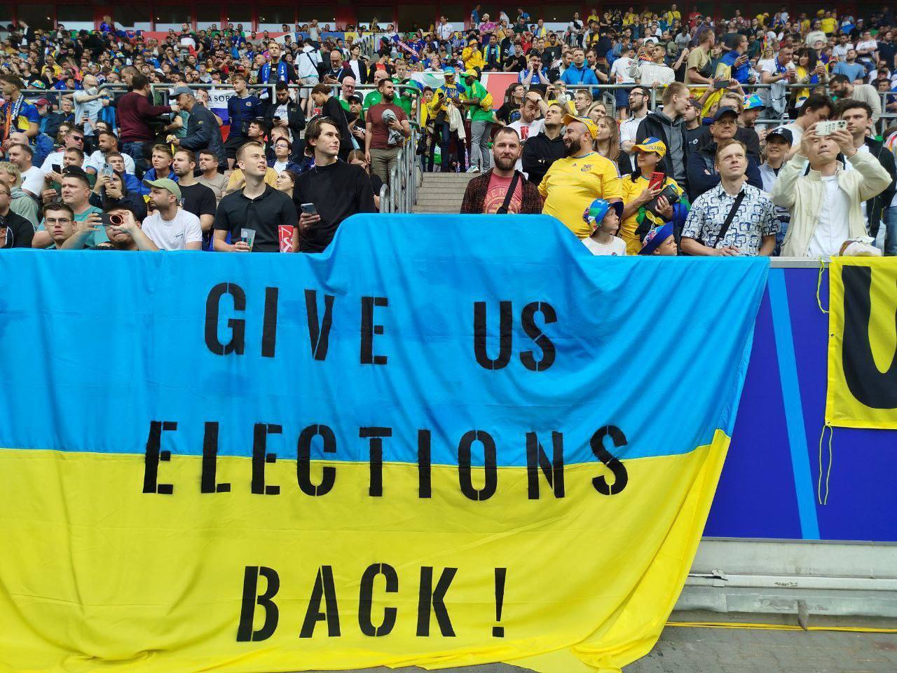 Флаг Незалежной с надписью Give us elections («Дайте нам выборы») вывесили с трибун во время матча сборной Украины и Словакии в немецком Дюссельдорфе.