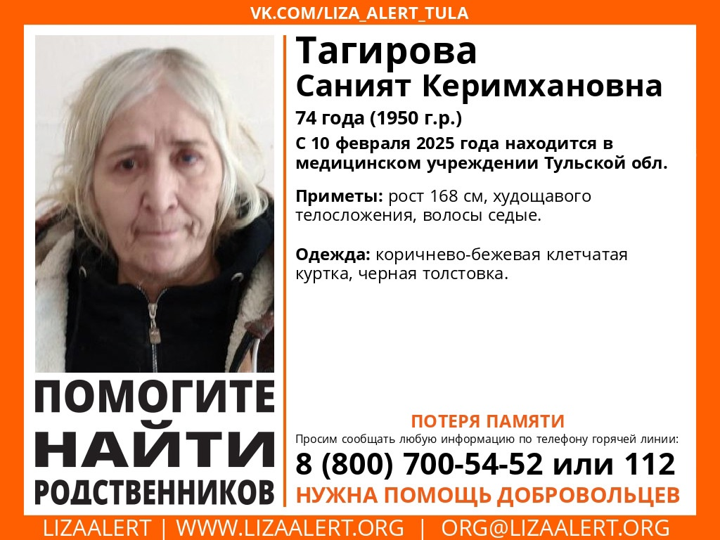 Уточняется, что разыскиваются родственники Тагировой Саният Керимхановны. Женщине 74, с 10 февраля она находится в медучреждении Тульской области с потерей памяти.