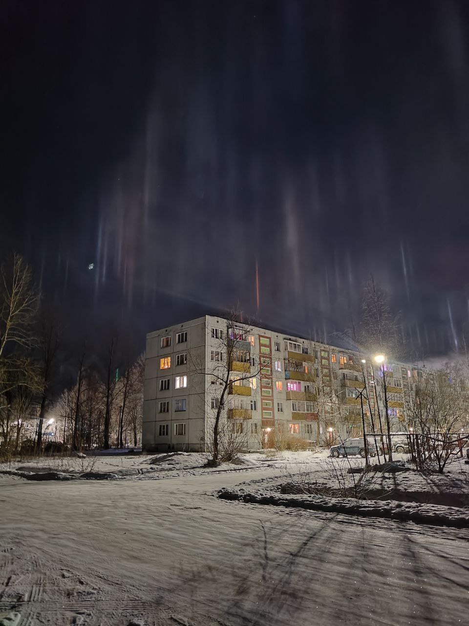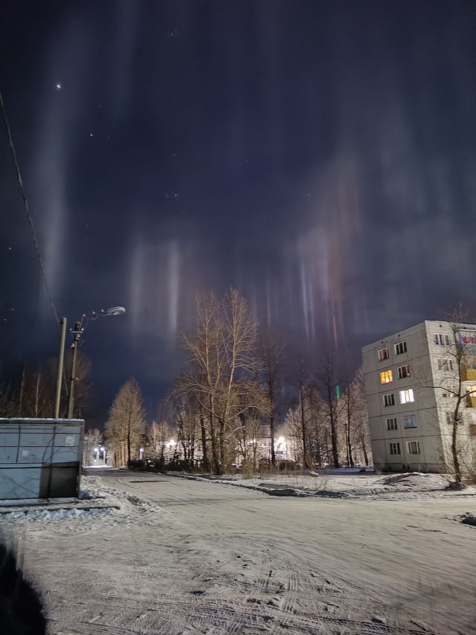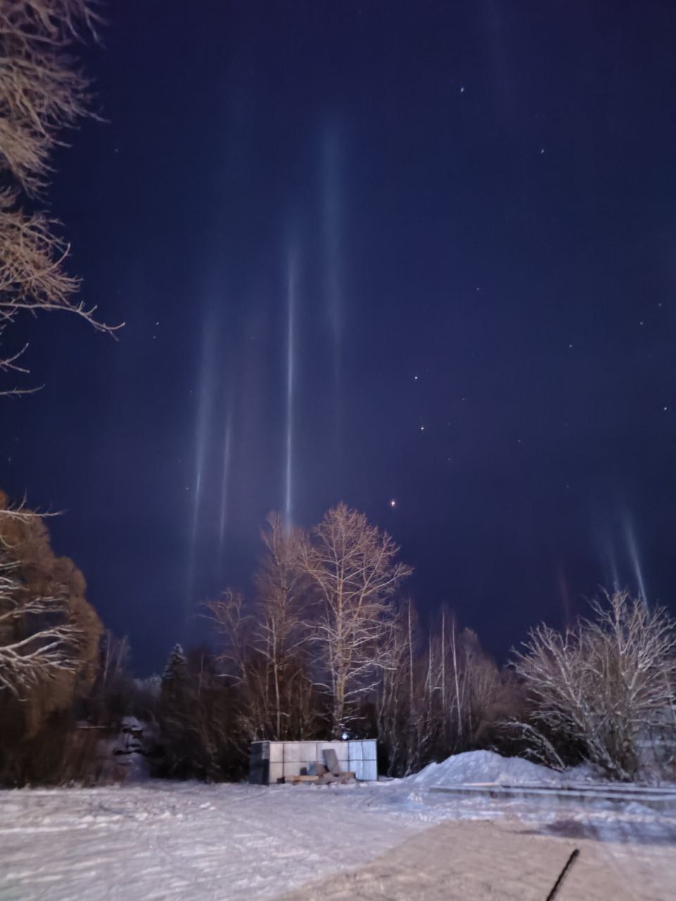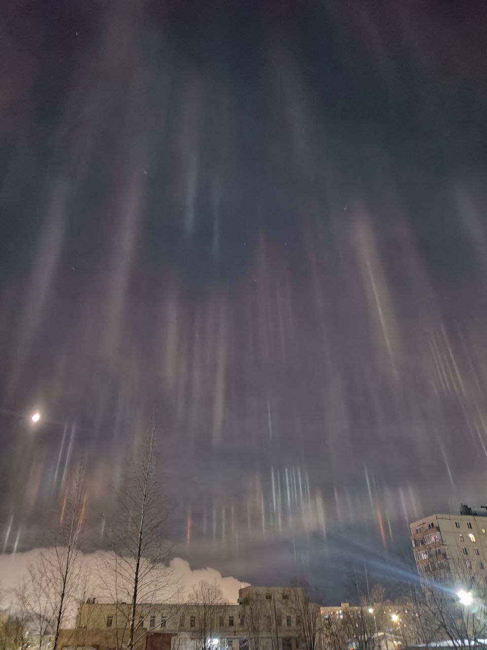 В сети появились фотографии удивительного явления — «полосатого» сияния. Это природное явление имеет простое объяснение. При низких температурах на большой высоте образуются крошечные ледяные кристаллы. Они формируются в облаках и спускаются к земле. Именно это создаёт эффект световых столбов.