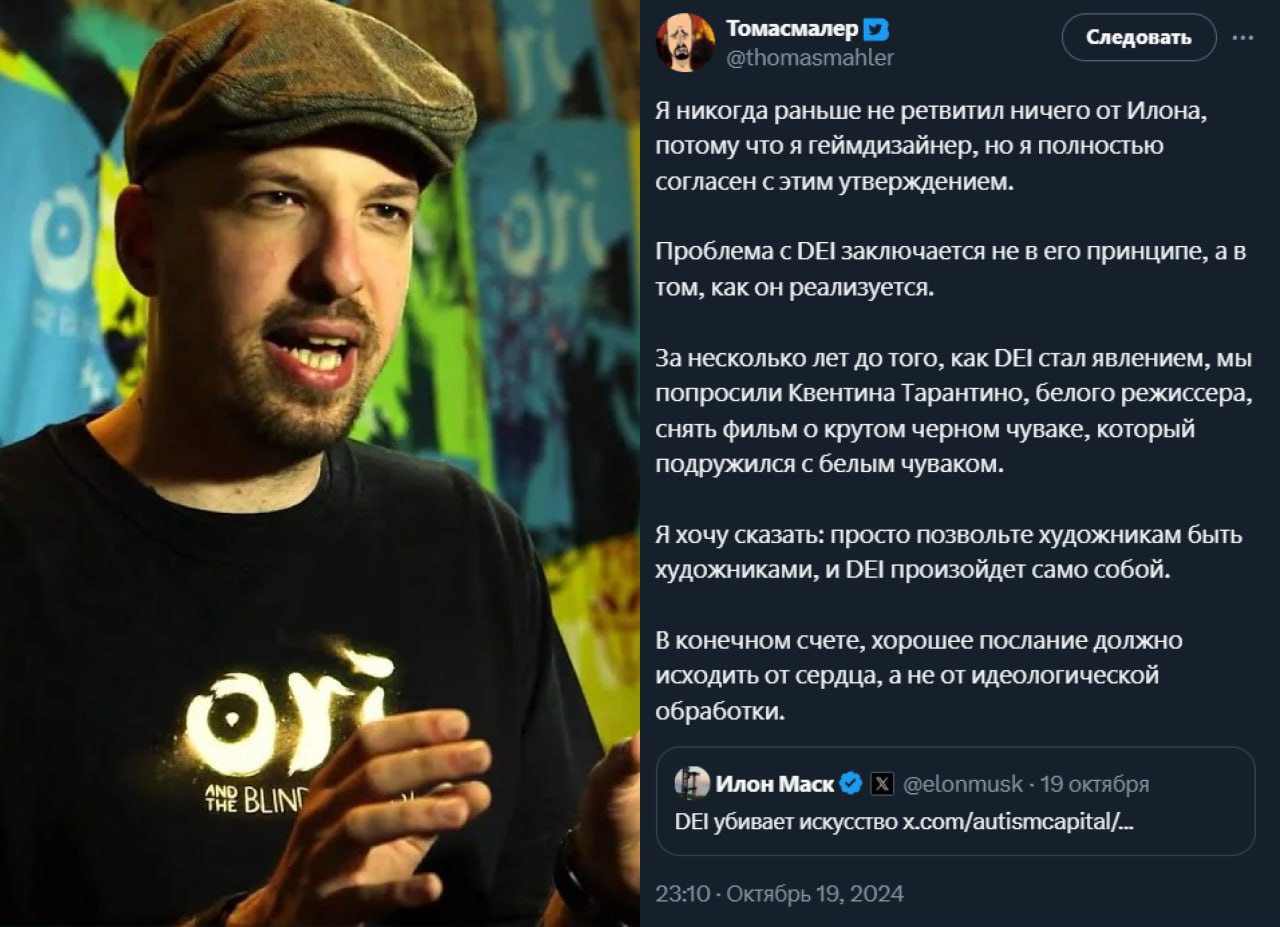 Создатель Ori and the Blind Forest поделился своим мнением о повесточке в играх. Он поддержал пост Маска, где тот называет DEI (разнообразие, равенство и инклюзивность) убийцей искусства.