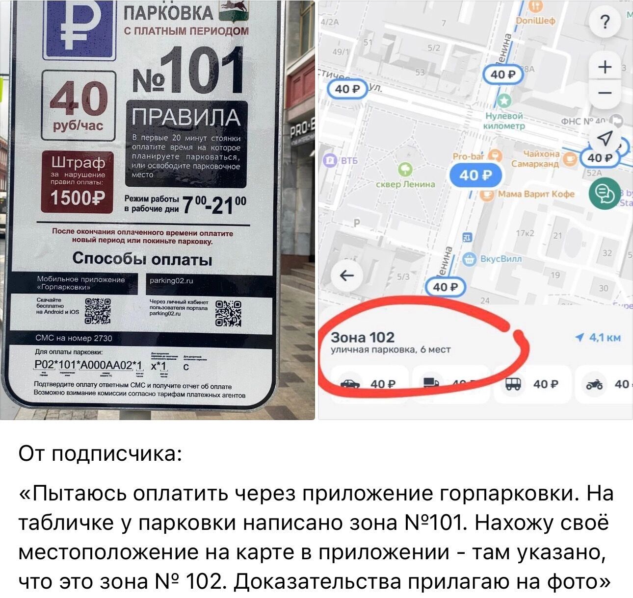 На практике это выглядит так: водитель пытается оплатить стоянку через официальное приложение, сканирует QR-код с парковочной таблички с номером зоны 101, а приложение сообщает, что он находится в зоне 102. Пользователи делятся скриншотами и фотографиями с места событий, недоумевая — как правильно заплатить, если данные не совпадают?